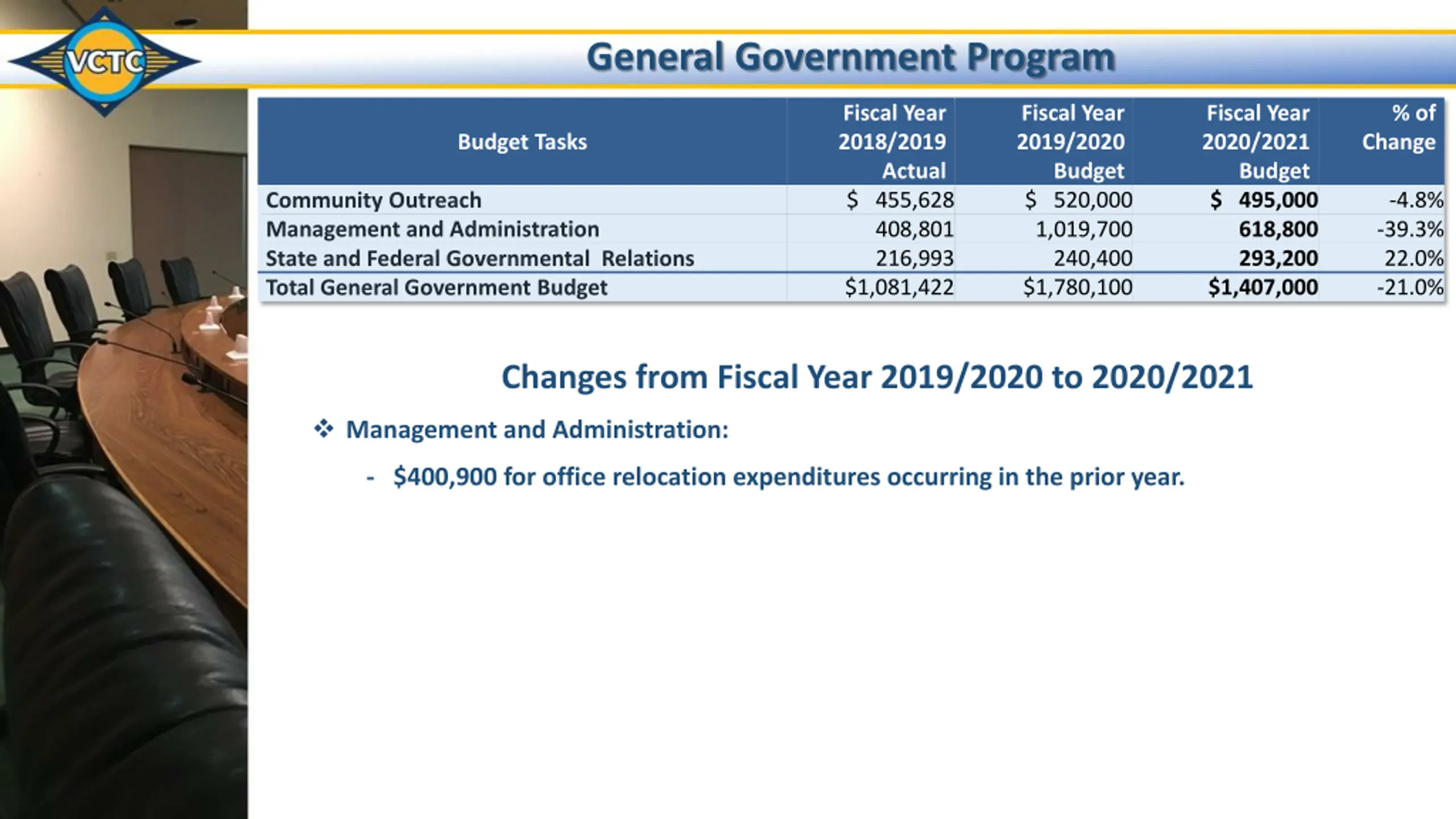 General Government Program Fiscal Year 2018/2019 Actual $ 455,628 408,801 216,993 $1,081,422 Fiscal Year 2019/2020 Budget $ 520,000 1,019,700 240,400 $1,780,100 Fiscal Year 2020/2021 Budget $ 495,000 618,800 293,200 $1,407,000 % of Budget Tasks Change -4.8% -39.3% 22.0% -21.0% Community Outreach Management and Administration State and Federal Governmental Relations Total General Government Budget Changes from Fiscal Year 2019/2020 to 2020/2021 Management and Administration: - $400,900 for office relocation expenditures occurring in the prior year.