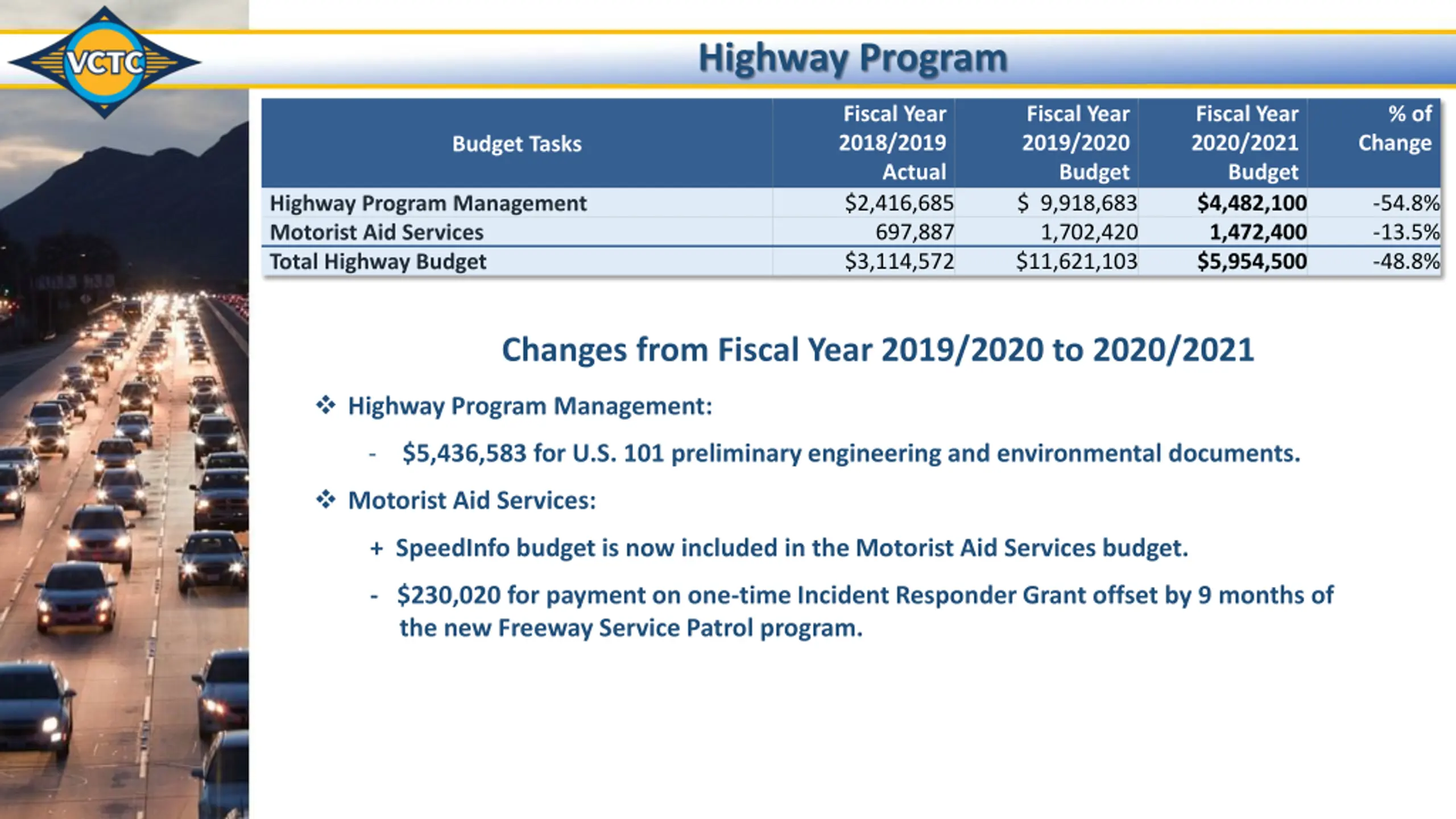 Highway Program Fiscal Year 2018/2019 Actual $2,416,685 697,887 $3,114,572 Fiscal Year 2019/2020 Budget $ 9,918,683 1,702,420 $11,621,103 Fiscal Year 2020/2021 Budget $4,482,100 1,472,400 $5,954,500 % of Change Budget Tasks -54.8% -13.5% -48.8% Highway Program Management Motorist Aid Services Total Highway Budget Changes from Fiscal Year 2019/2020 to 2020/2021 Highway Program Management: - $5,436,583 for U.S. 101 preliminary engineering and environmental documents. Motorist Aid Services: + SpeedInfo budget is now included in the Motorist Aid Services budget. - $230,020 for payment on one-time Incident Responder Grant offset by 9 months of the new Freeway Service Patrol program.
