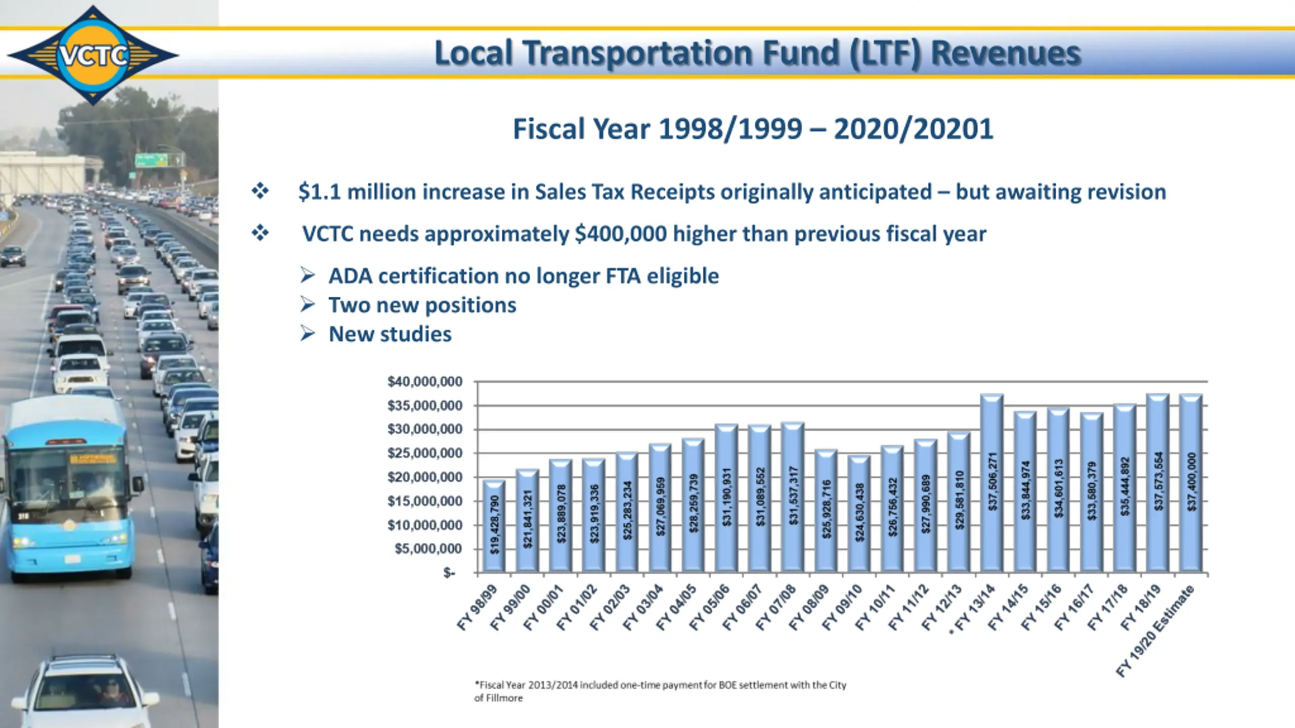 Local Transportation Fund (LTF) Revenues Fiscal Year 1998/1999 2020/20201 $1.1 million increase in Sales Tax Receipts originally anticipated but awaiting revision VCTC needs approximately $400,000 higher than previous fiscal year ADA certification no longer FTA eligible Two new positions New studies
