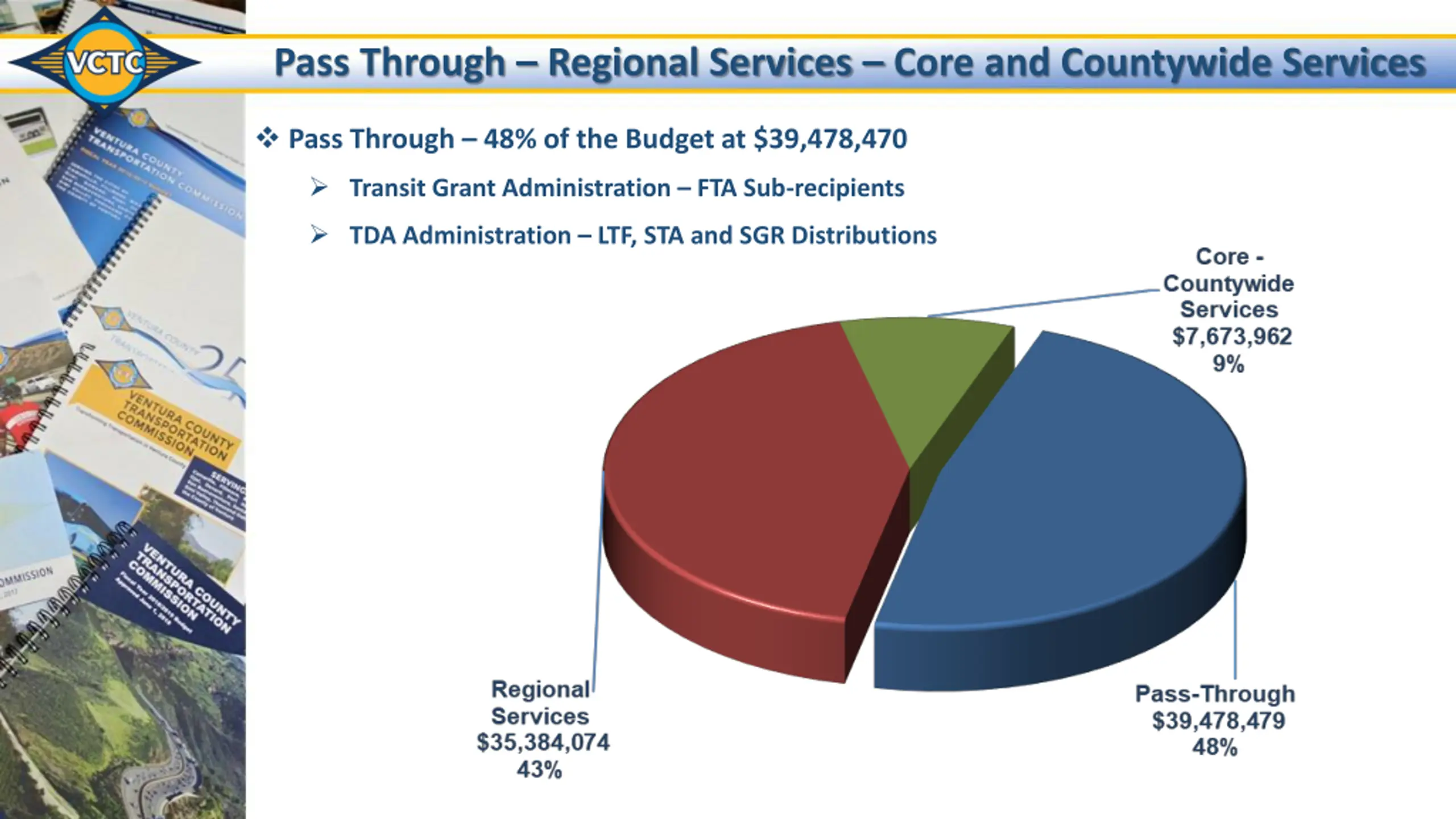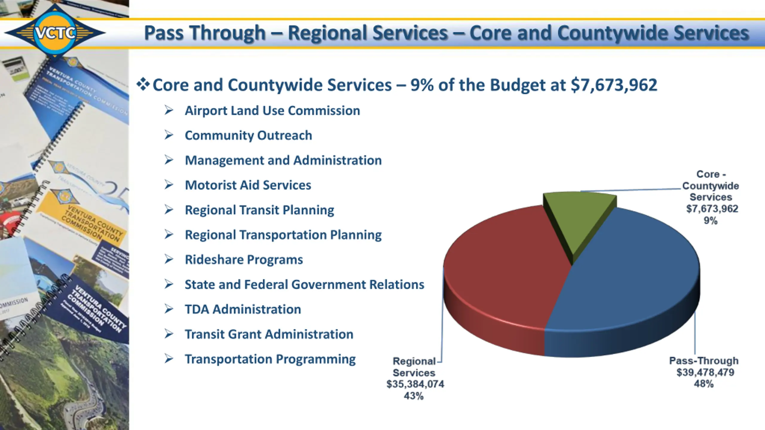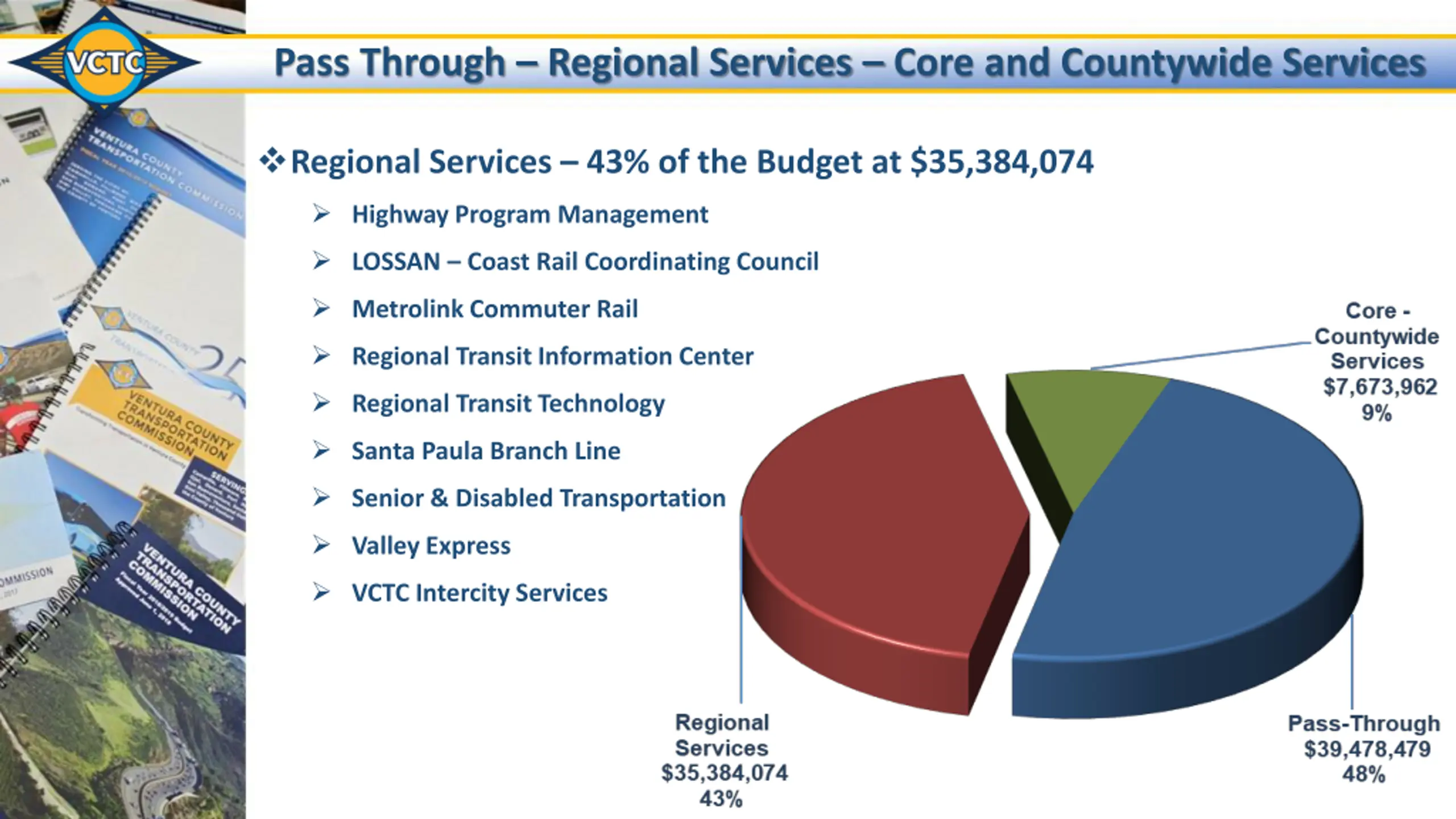 Pass Through Regional Services Core and Countywide Services Regional Services 43% of the Budget at $35,384,074 Highway Program Management LOSSAN Coast Rail Coordinating Council Metrolink Commuter Rail Regional Transit Information Center Regional Transit Technology Santa Paula Branch Line Senior & Disabled Transportation Valley Express VCTC Intercity Services