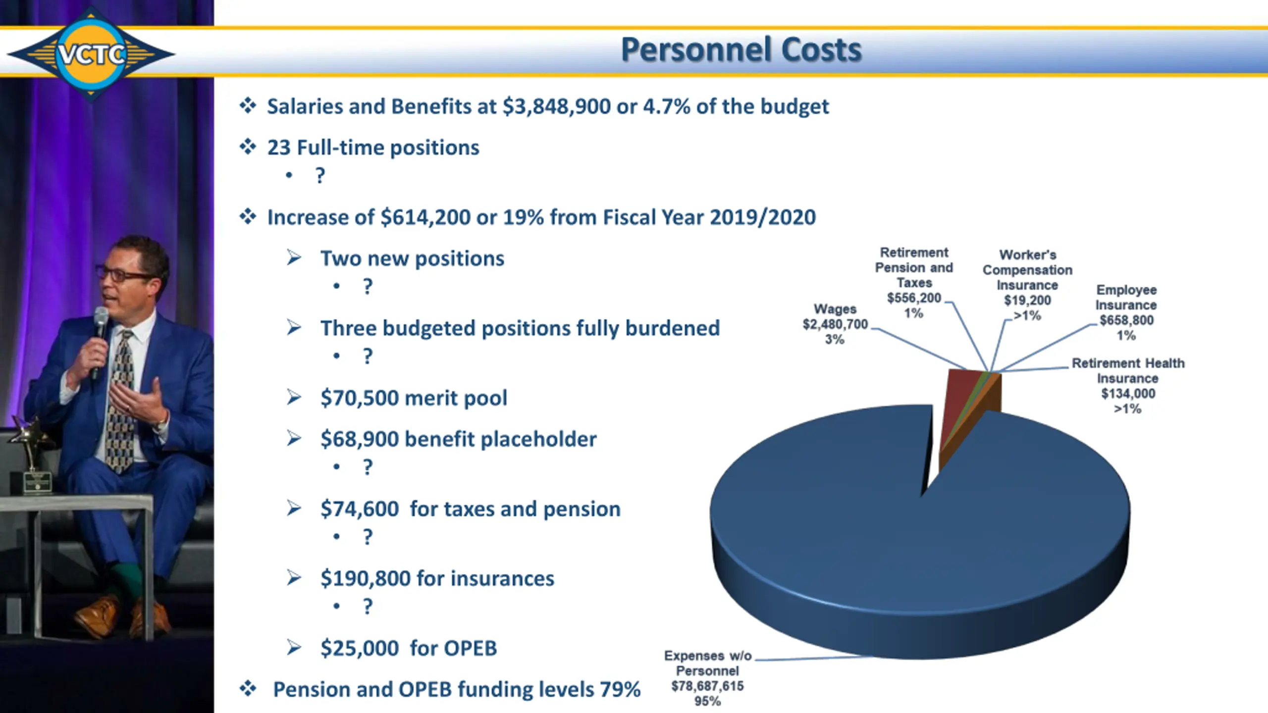 Personnel Costs Salaries and Benefits at $3,848,900 or 4.7% of the budget 23 Full-time positions ? Increase of $614,200 or 19% from Fiscal Year 2019/2020 Two new positions ? Three budgeted positions fully burdened ? $70,500 merit pool $68,900 benefit placeholder ? $74,600 for taxes and pension ? $190,800 for insurances ? $25,000 for OPEB Pension and OPEB funding levels 79%