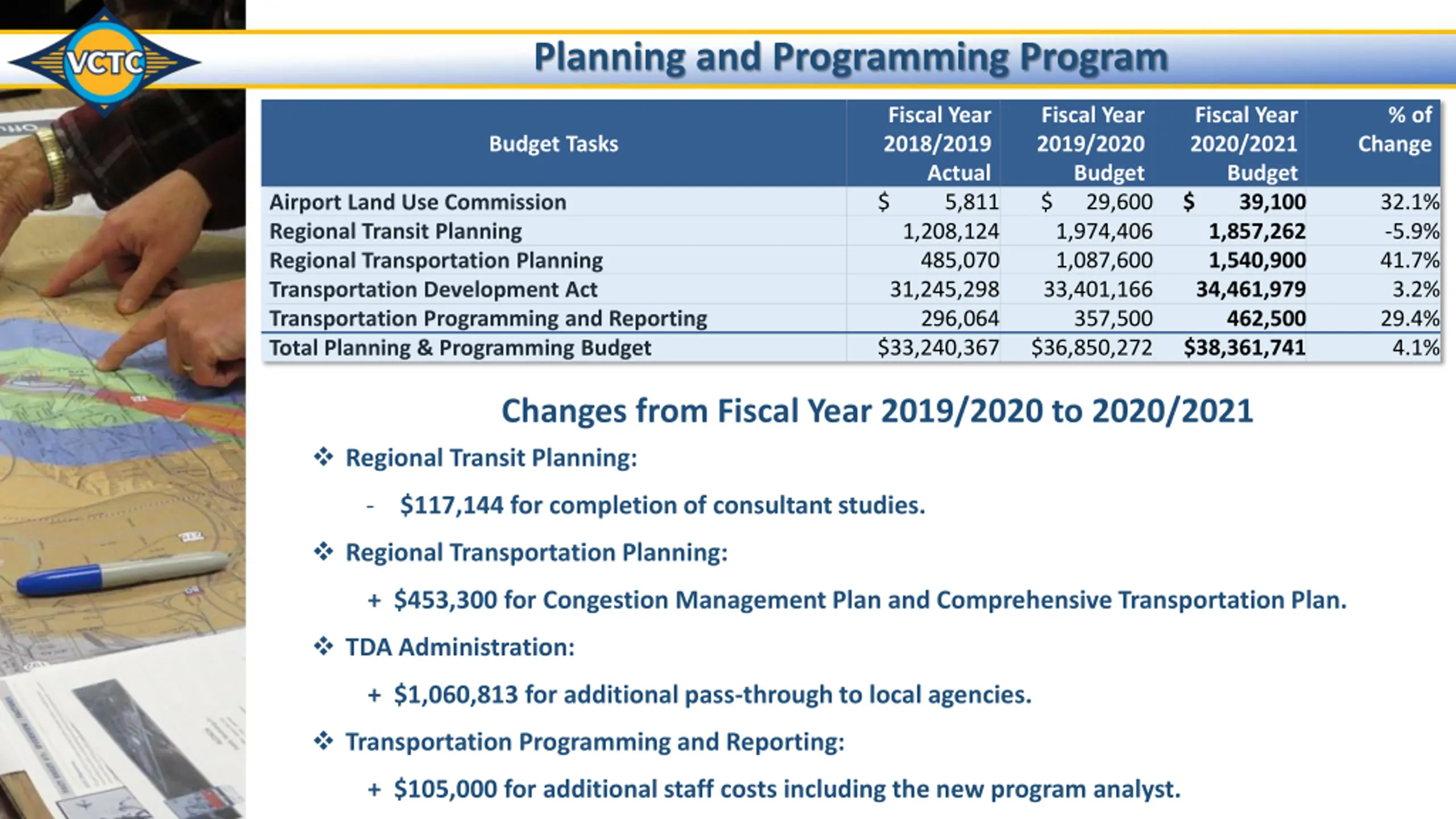 Planning and Programming Program Fiscal Year 2018/2019 Actual $ 1,208,124 485,070 31,245,298 296,064 $33,240,367 Fiscal Year 2019/2020 Budget $ 29,600 1,974,406 1,087,600 33,401,166 357,500 $36,850,272 Fiscal Year 2020/2021 Budget $ 39,100 1,857,262 1,540,900 34,461,979 462,500 $38,361,741 % of Budget Tasks Change 5,811 32.1% -5.9% 41.7% 3.2% 29.4% 4.1% Airport Land Use Commission Regional Transit Planning Regional Transportation Planning Transportation Development Act Transportation Programming and Reporting Total Planning & Programming Budget Changes from Fiscal Year 2019/2020 to 2020/2021 Regional Transit Planning: - $117,144 for completion of consultant studies. Regional Transportation Planning: + $453,300 for Congestion Management Plan and Comprehensive Transportation Plan. TDA Administration: + $1,060,813 for additional pass-through to local agencies. Transportation Programming and Reporting: + $105,000 for additional staff costs including the new program analyst.