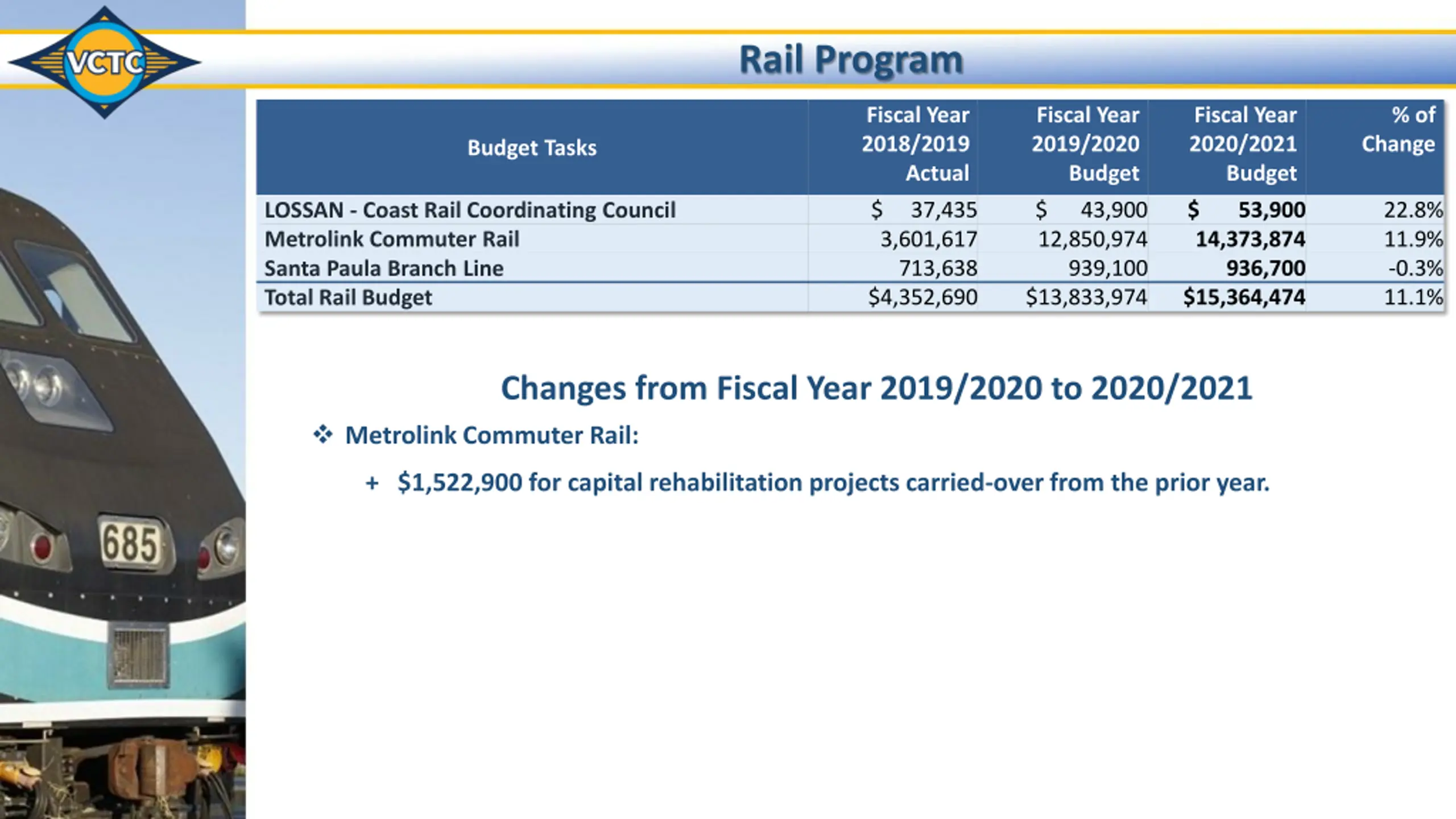 Rail Program Fiscal Year 2018/2019 Actual Fiscal Year 2019/2020 Budget Fiscal Year 2020/2021 Budget % of Change Budget Tasks $ 37,435 3,601,617 713,638 $4,352,690 $ 12,850,974 939,100 $13,833,974 43,900 $ 53,900 14,373,874 936,700 $15,364,474 22.8% 11.9% -0.3% 11.1% LOSSAN - Coast Rail Coordinating Council Metrolink Commuter Rail Santa Paula Branch Line Total Rail Budget Changes from Fiscal Year 2019/2020 to 2020/2021 Metrolink Commuter Rail: + $1,522,900 for capital rehabilitation projects carried-over from the prior year.
