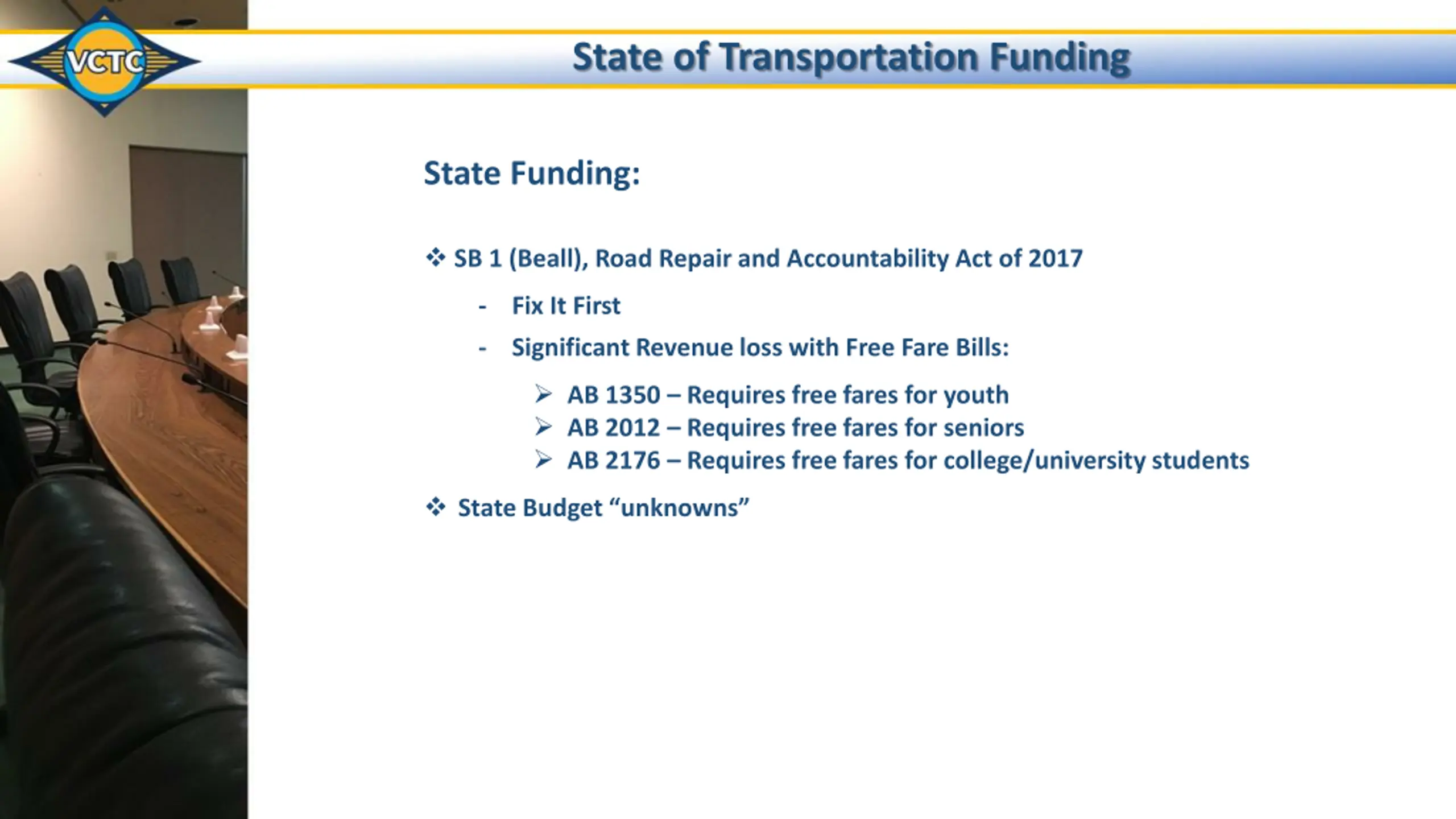 State of Transportation Funding State Funding: SB 1 (Beall), Road Repair and Accountability Act of 2017 - Fix It First - Significant Revenue loss with Free Fare Bills: AB 1350 Requires free fares for youth AB 2012 Requires free fares for seniors AB 2176 Requires free fares for college/university students State Budget unknowns