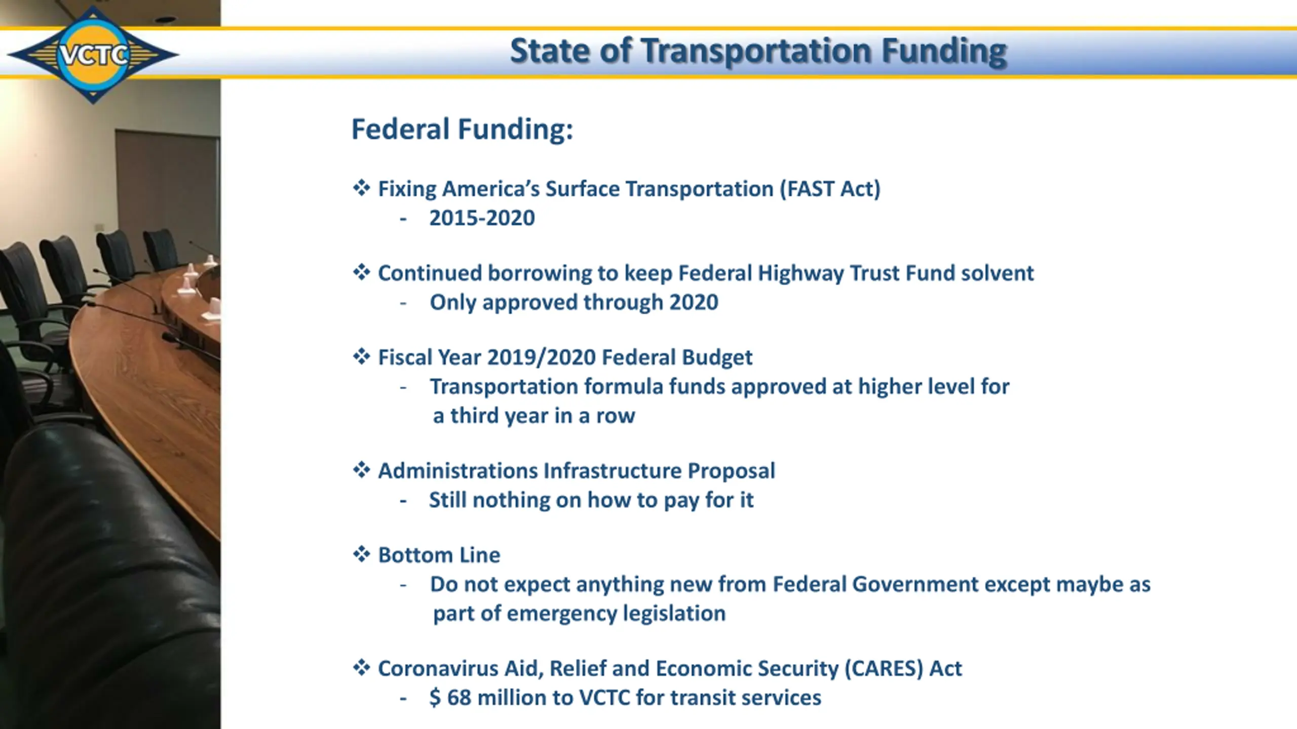 State of Transportation Funding Federal Funding: Fixing America s Surface Transportation (FAST Act) - 2015-2020 Continued borrowing to keep Federal Highway Trust Fund solvent - Only approved through 2020 Fiscal Year 2019/2020 Federal Budget - Transportation formula funds approved at higher level for a third year in a row Administrations Infrastructure Proposal - Still nothing on how to pay for it Bottom Line - part of emergency legislation Do not expect anything new from Federal Government except maybe as Coronavirus Aid, Relief and Economic Security (CARES) Act - $ 68 million to VCTC for transit services