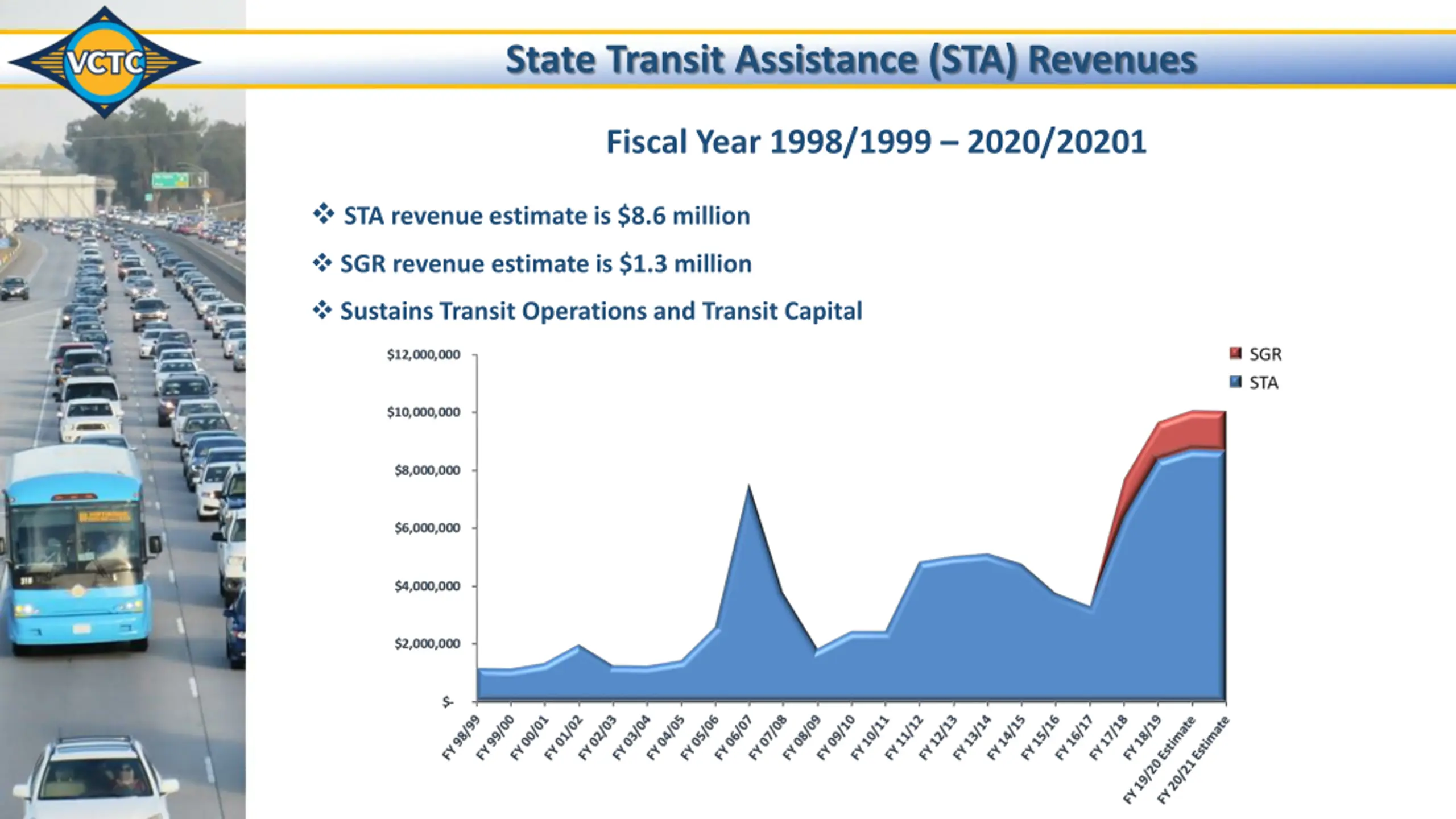 State Transit Assistance (STA) Revenues Fiscal Year 1998/1999 2020/20201 STA revenue estimate is $8.6 million SGR revenue estimate is $1.3 million Sustains Transit Operations and Transit Capital