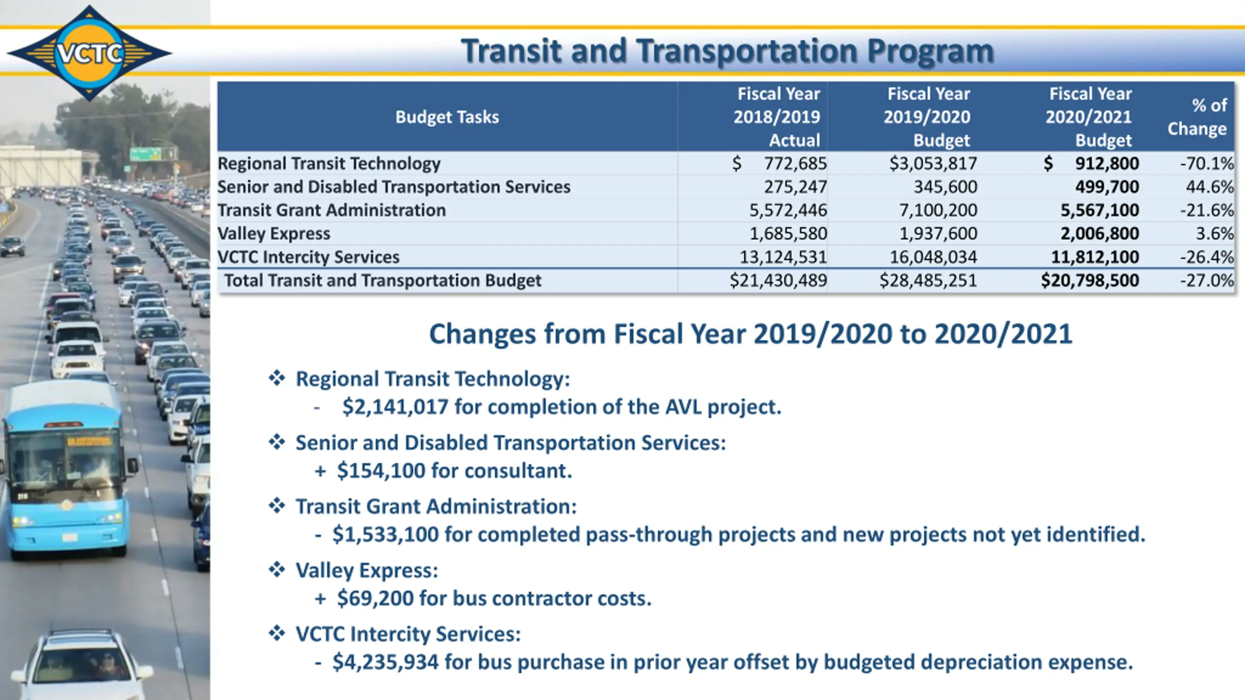 Transit and Transportation Program Fiscal Year 2018/2019 Actual $ 772,685 275,247 5,572,446 1,685,580 13,124,531 $21,430,489 Fiscal Year 2019/2020 Budget $3,053,817 345,600 7,100,200 1,937,600 16,048,034 $28,485,251 Fiscal Year 2020/2021 Budget $ 912,800 499,700 5,567,100 2,006,800 11,812,100 $20,798,500 % of Budget Tasks Change Regional Transit Technology Senior and Disabled Transportation Services Transit Grant Administration Valley Express VCTC Intercity Services Total Transit and Transportation Budget -70.1% 44.6% -21.6% 3.6% -26.4% -27.0% Changes from Fiscal Year 2019/2020 to 2020/2021 Regional Transit Technology: - $2,141,017 for completion of the AVL project. Senior and Disabled Transportation Services: + $154,100 for consultant. Transit Grant Administration: - $1,533,100 for completed pass-through projects and new projects not yet identified. Valley Express: + $69,200 for bus contractor costs. VCTC Intercity Services: - $4,235,934 for bus purchase in prior year offset by budgeted depreciation expense.