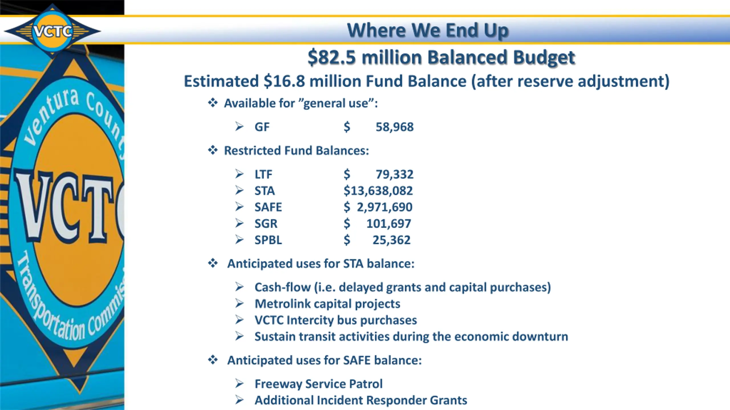 Where We End Up $82.5 million Balanced Budget Estimated $16.8 million Fund Balance (after reserve adjustment) Available for general use : GF $ 58,968 Restricted Fund Balances: LTF STA SAFE SGR SPBL $ 79,332 $13,638,082 $ 2,971,690 $ 101,697 $ 25,362 Anticipated uses for STA balance: Cash-flow (i.e. delayed grants and capital purchases) Metrolink capital projects VCTC Intercity bus purchases Sustain transit activities during the economic downturn Anticipated uses for SAFE balance: Freeway Service Patrol Additional Incident Responder Grants