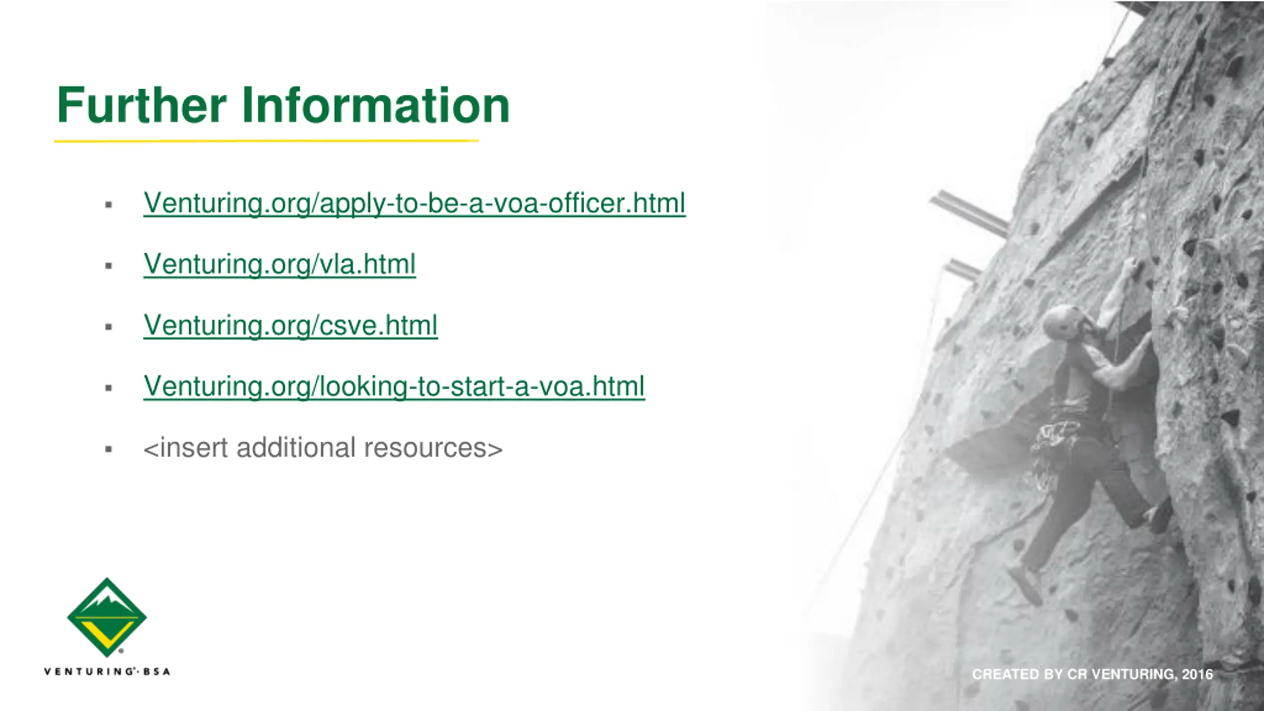 Further Information Venturing.org/apply-to-be-a-voa-officer.html Venturing.org/vla.html Venturing.org/csve.html Venturing.org/looking-to-start-a-voa.html <insert additional resources> CREATED BY CR VENTURING, 2016