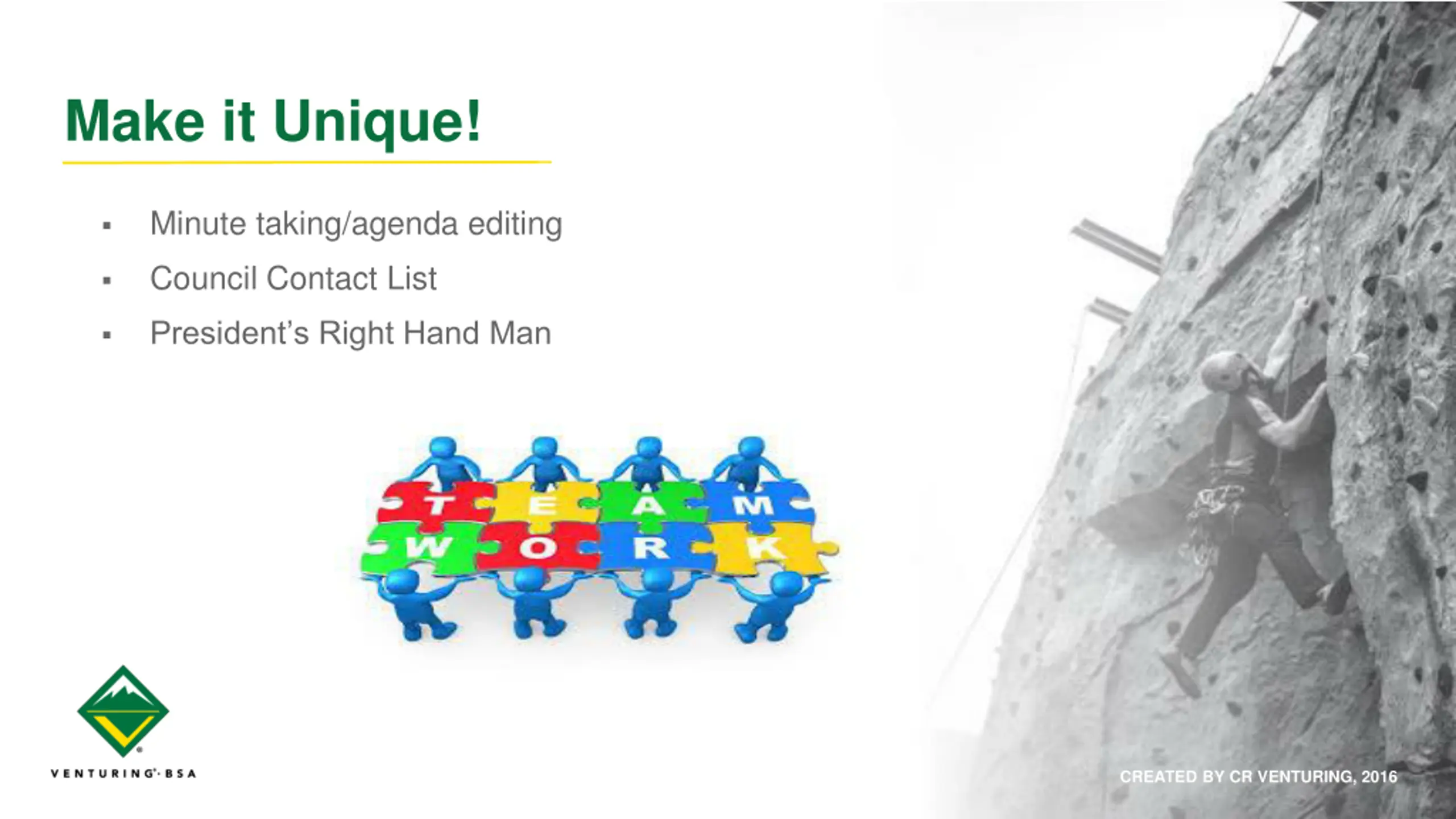 Make it Unique! Minute taking/agenda editing Council Contact List President s Right Hand Man CREATED BY CR VENTURING, 2016