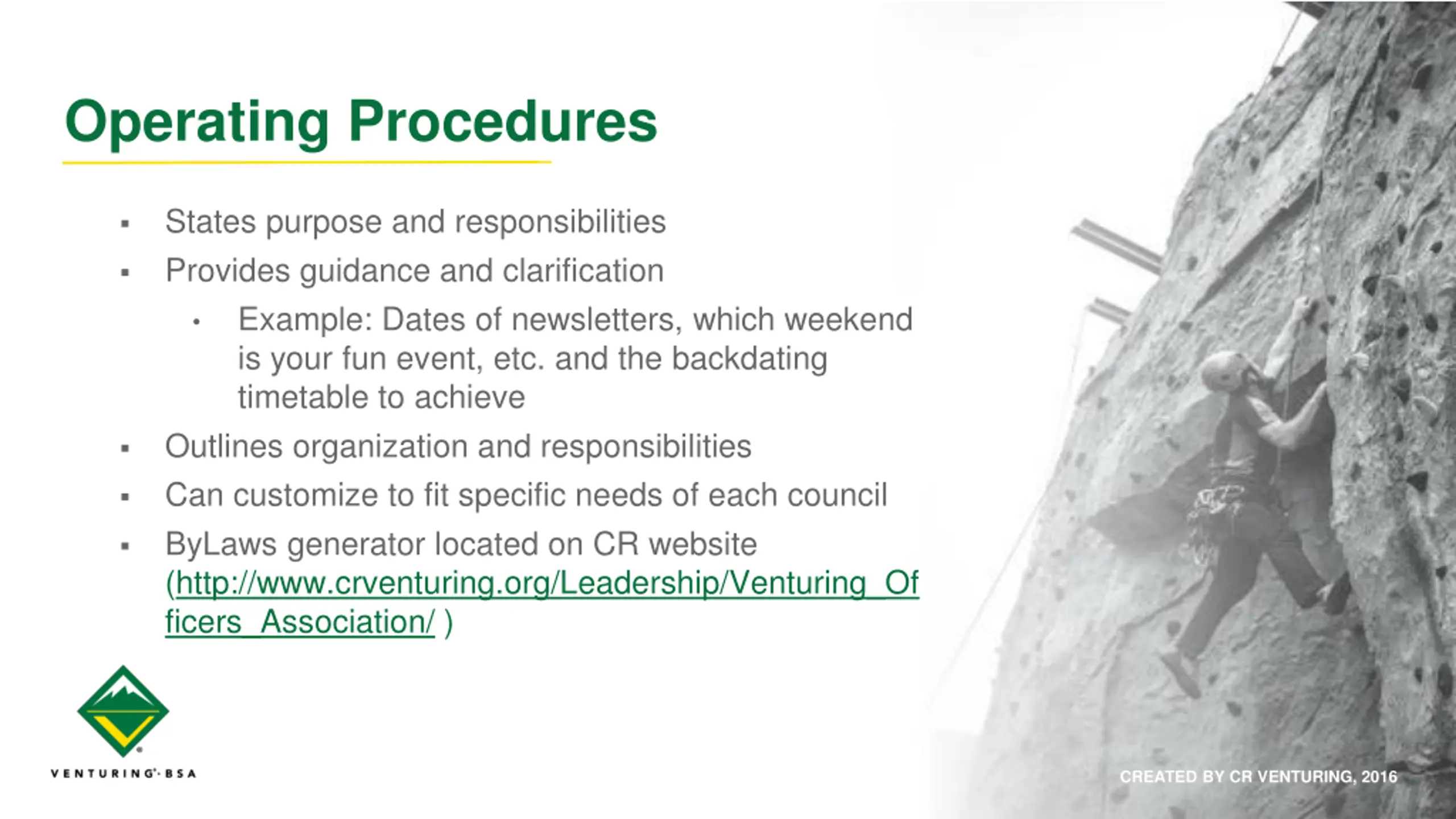 Operating Procedures States purpose and responsibilities Provides guidance and clarification Example: Dates of newsletters, which weekend is your fun event, etc. and the backdating timetable to achieve Outlines organization and responsibilities Can customize to fit specific needs of each council ByLaws generator located on CR website (http://www.crventuring.org/Leadership/Venturing_Of ficers_Association/ ) CREATED BY CR VENTURING, 2016