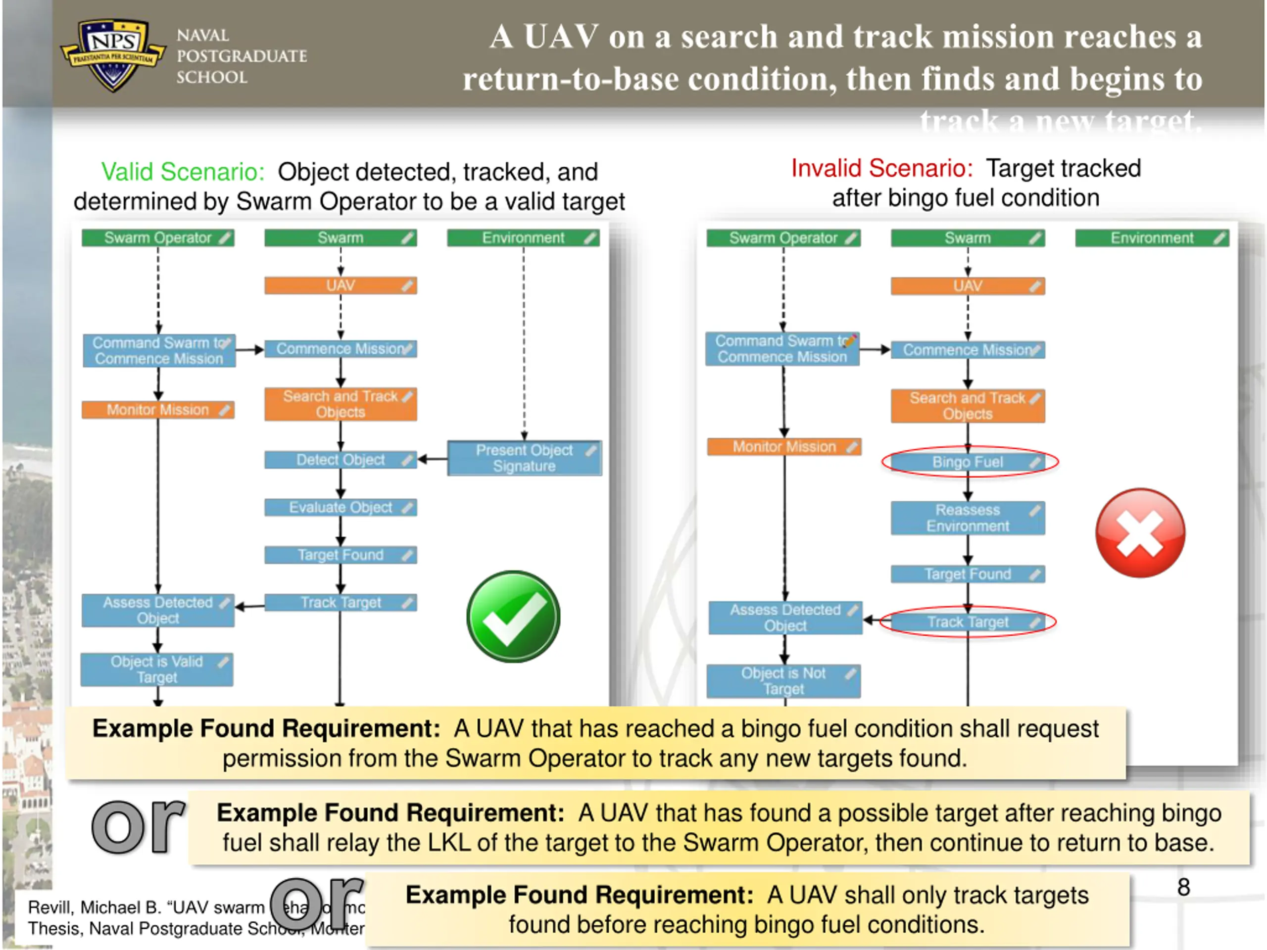 A UAV on a search and track mission reaches a return-to-base condition, then finds and begins to track a new target. Invalid Scenario: Target tracked after bingo fuel condition Valid Scenario: Object detected, tracked, and determined by Swarm Operator to be a valid target Example Found Requirement: A UAV that has reached a bingo fuel condition shall request permission from the Swarm Operator to track any new targets found. or Example Found Requirement: A UAV that has found a possible target after reaching bingo fuel shall relay the LKL of the target to the Swarm Operator, then continue to return to base. Revill, Michael B. UAV swarm behavior modeling for early exposure of failure modes. Master's Thesis, Naval Postgraduate School, Monterey, CA. September 2016. or 8 Example Found Requirement: A UAV shall only track targets found before reaching bingo fuel conditions.