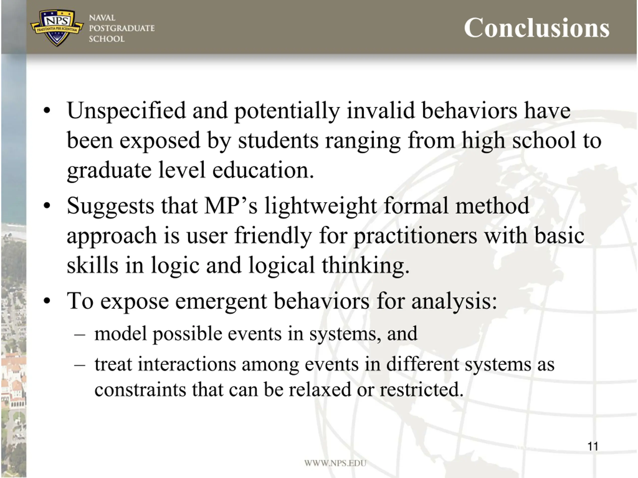 Conclusions Unspecified and potentially invalid behaviors have been exposed by students ranging from high school to graduate level education. Suggests that MP s lightweight formal method approach is user friendly for practitioners with basic skills in logic and logical thinking. To expose emergent behaviors for analysis: model possible events in systems, and treat interactions among events in different systems as constraints that can be relaxed or restricted. 11