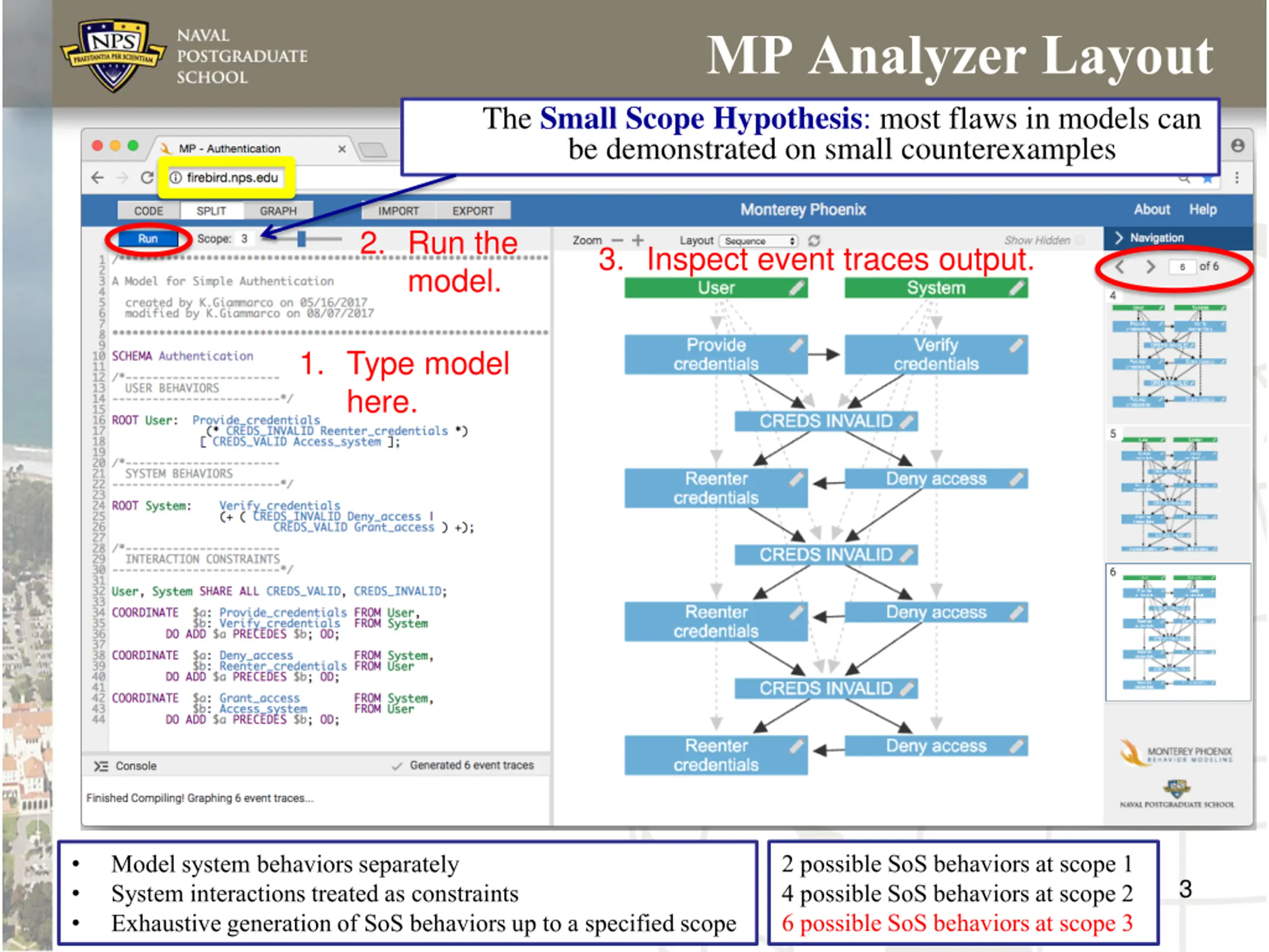 MP Analyzer Layout The Small Scope Hypothesis:most flaws in models can be demonstrated on small counterexamples 2. Run the model. 3. Inspect event traces output. 1. Type model here. 2 possible SoS behaviors at scope 1 4 possible SoS behaviors at scope 2 6 possible SoS behaviors at scope 3 Model system behaviors separately System interactions treated as constraints Exhaustive generation of SoS behaviors up to a specified scope 3