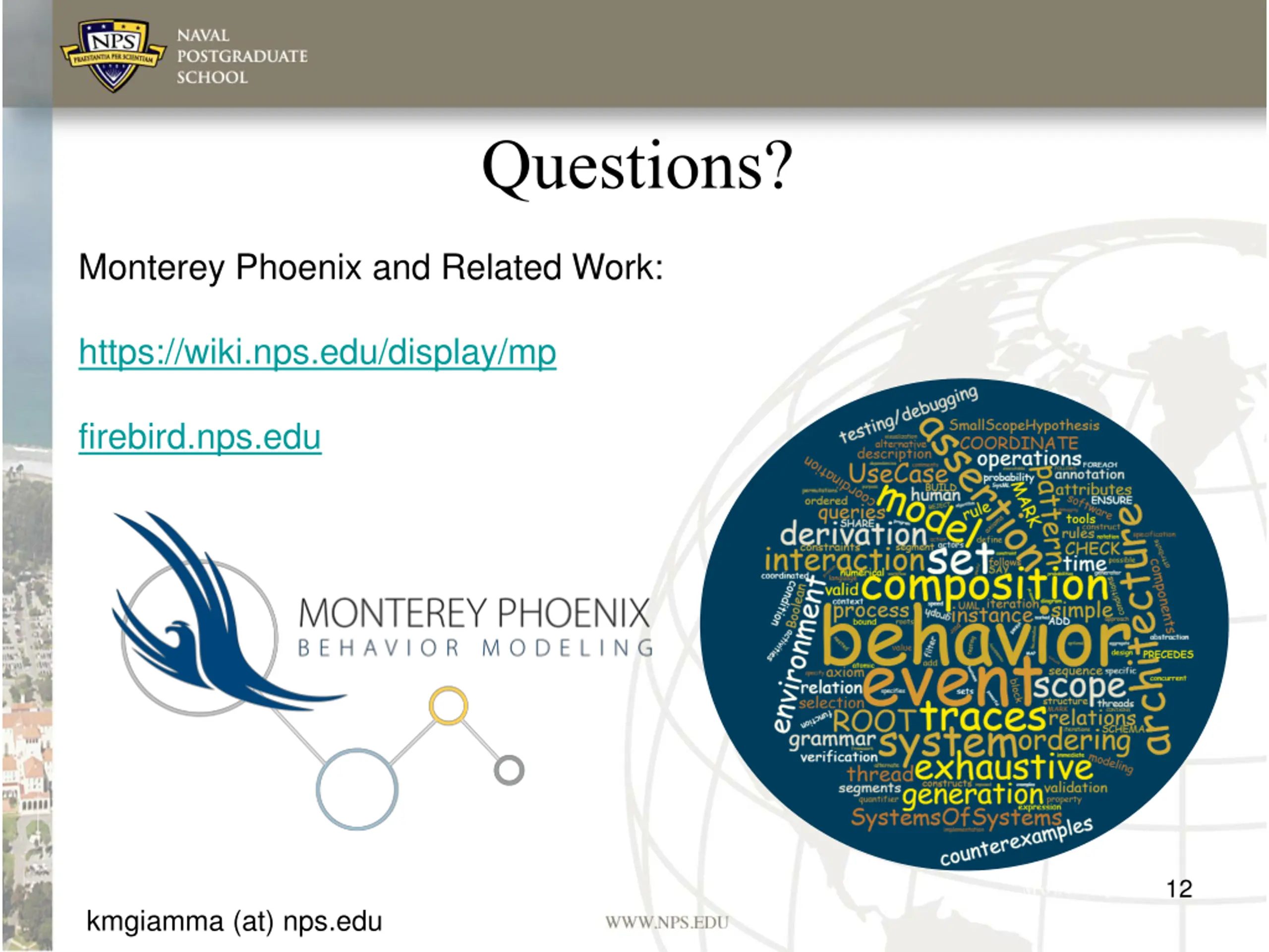 Questions? Monterey Phoenix and Related Work: https://wiki.nps.edu/display/mp firebird.nps.edu 12 kmgiamma (at) nps.edu