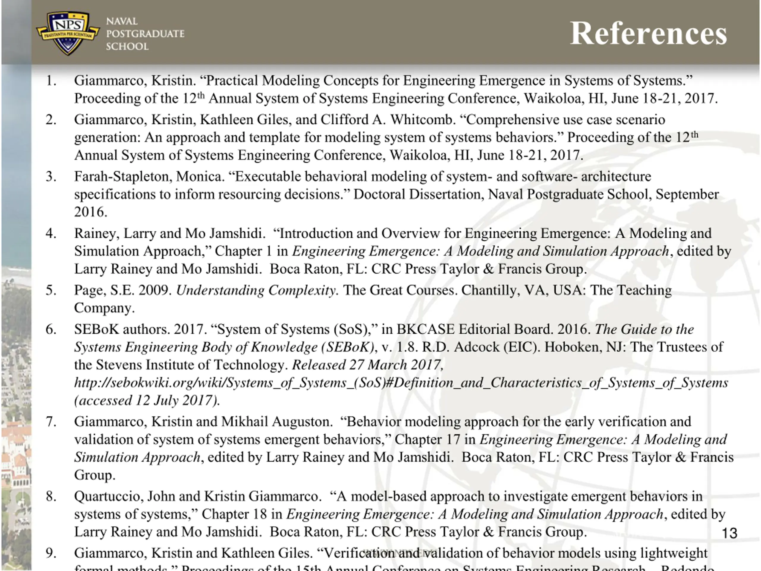 References 1. Giammarco, Kristin. Practical Modeling Concepts for Engineering Emergence in Systems of Systems. Proceeding of the 12th Annual System of Systems Engineering Conference, Waikoloa, HI, June 18-21, 2017. Giammarco, Kristin, Kathleen Giles, and Clifford A. Whitcomb. Comprehensive use case scenario generation: An approach and template for modeling system of systems behaviors. Proceeding of the 12th Annual System of Systems Engineering Conference, Waikoloa, HI, June 18-21, 2017. Farah-Stapleton, Monica. Executable behavioral modeling of system- and software- architecture specifications to inform resourcing decisions. Doctoral Dissertation, Naval Postgraduate School, September 2016. Rainey, Larry and Mo Jamshidi. Introduction and Overview for Engineering Emergence: A Modeling and Simulation Approach, Chapter 1 in Engineering Emergence: A Modeling and Simulation Approach, edited by Larry Rainey and Mo Jamshidi. Boca Raton, FL: CRC Press Taylor & Francis Group. Page, S.E. 2009. Understanding Complexity. The Great Courses. Chantilly, VA, USA: The Teaching Company. SEBoK authors. 2017. System of Systems (SoS), in BKCASE Editorial Board. 2016. The Guide to the Systems Engineering Body of Knowledge (SEBoK), v. 1.8. R.D. Adcock (EIC). Hoboken, NJ: The Trustees of the Stevens Institute of Technology. Released 27 March 2017, http://sebokwiki.org/wiki/Systems_of_Systems_(SoS)#Definition_and_Characteristics_of_Systems_of_Systems (accessed 12 July 2017). Giammarco, Kristin and Mikhail Auguston. Behavior modeling approach for the early verification and validation of system of systems emergent behaviors, Chapter 17 in Engineering Emergence: A Modeling and Simulation Approach, edited by Larry Rainey and Mo Jamshidi. Boca Raton, FL: CRC Press Taylor & Francis Group. Quartuccio, John and Kristin Giammarco. A model-based approach to investigate emergent behaviors in systems of systems, Chapter 18 in Engineering Emergence: A Modeling and Simulation Approach, edited by Larry Rainey and Mo Jamshidi. Boca Raton, FL: CRC Press Taylor & Francis Group. Giammarco, Kristin and Kathleen Giles. Verification and validation of behavior models using lightweight formal methods. Proceedings of the 15th Annual Conference on Systems Engineering Research. Redondo 2. 3. 4. 5. 6. 7. 8. 13 9.