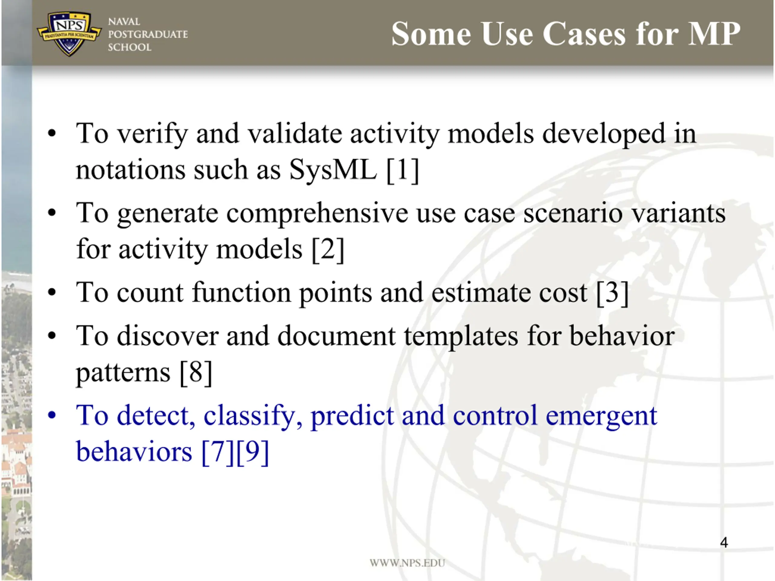 Some Use Cases for MP To verify and validate activity models developed in notations such as SysML [1] To generate comprehensive use case scenario variants for activity models [2] To count function points and estimate cost [3] To discover and document templates for behavior patterns [8] To detect, classify, predict and control emergent behaviors [7][9] 4