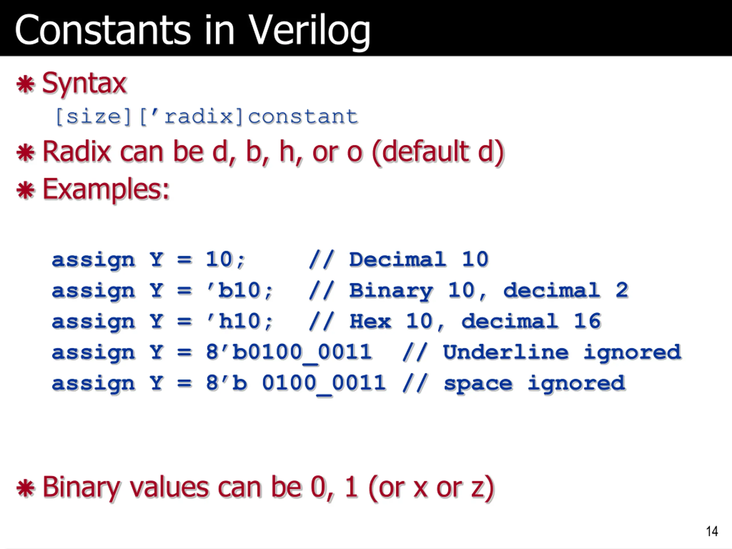 Constants in Verilog Syntax [size][ radix]constant Radix can be d, b, h, or o (default d) Examples: assign Y = 10; assign Y = b10; // Binary 10, decimal 2 assign Y = h10; // Hex 10, decimal 16 assign Y = 8 b0100_0011 // Underline ignored assign Y = 8 b 0100_0011 // space ignored // Decimal 10 Binary values can be 0, 1 (or x or z) 14