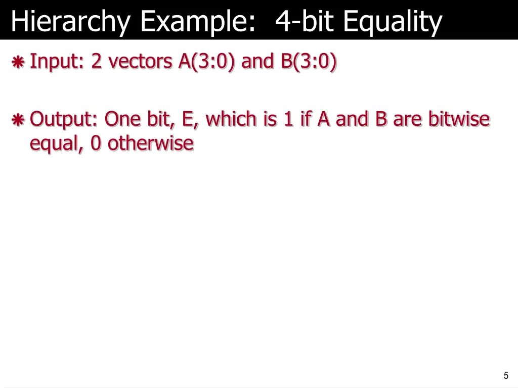 Hierarchy Example: 4-bit Equality Input: 2 vectors A(3:0) and B(3:0) Output: One bit, E, which is 1 if A and B are bitwise equal, 0 otherwise 5