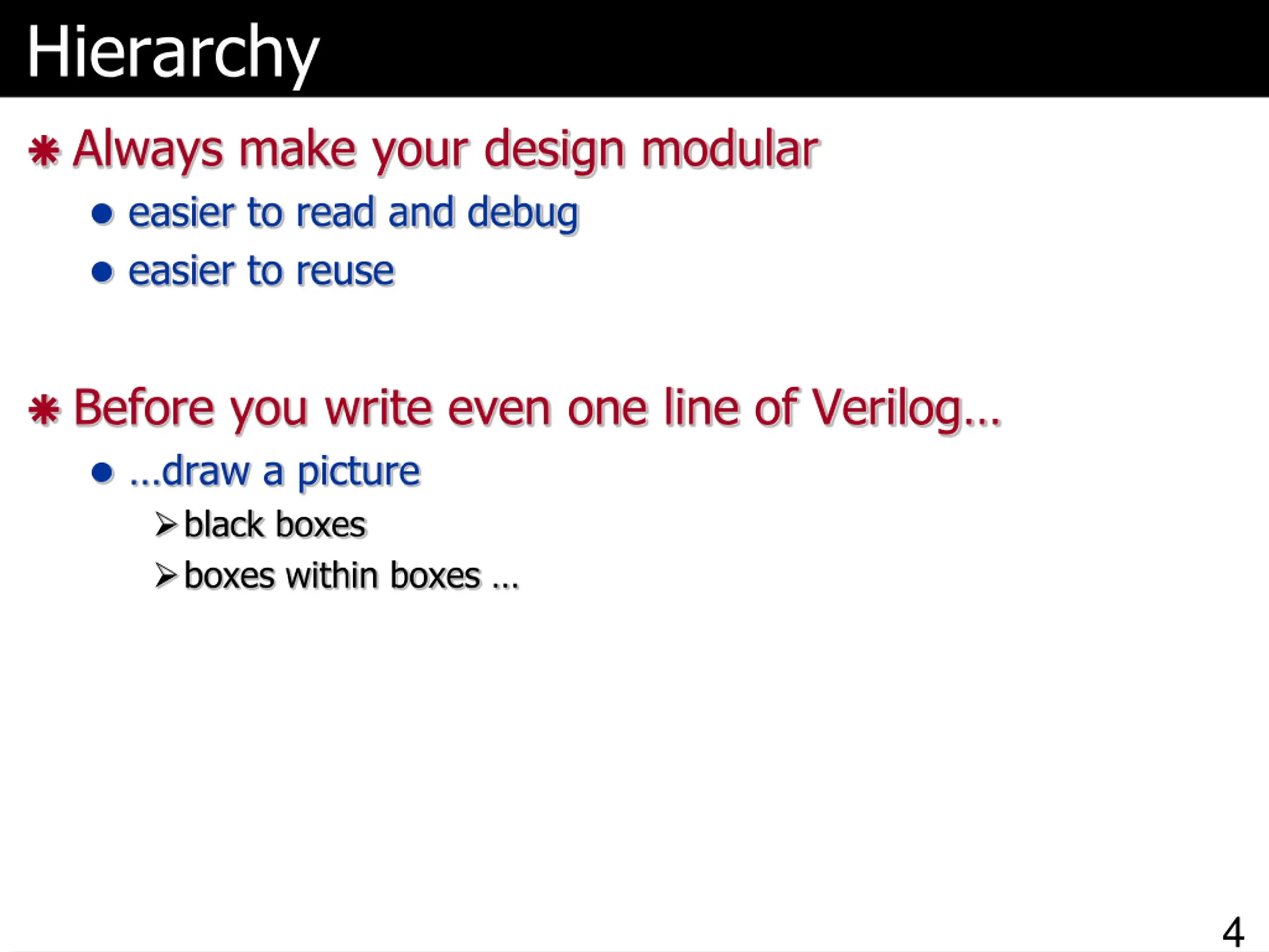 Design Hierarchy Just like with large program, to design a large chip need hierarchy Divide and Conquer To create, test, and also to understand Block in a block diagram is equivalent to object in a programming language module in Verilog 3