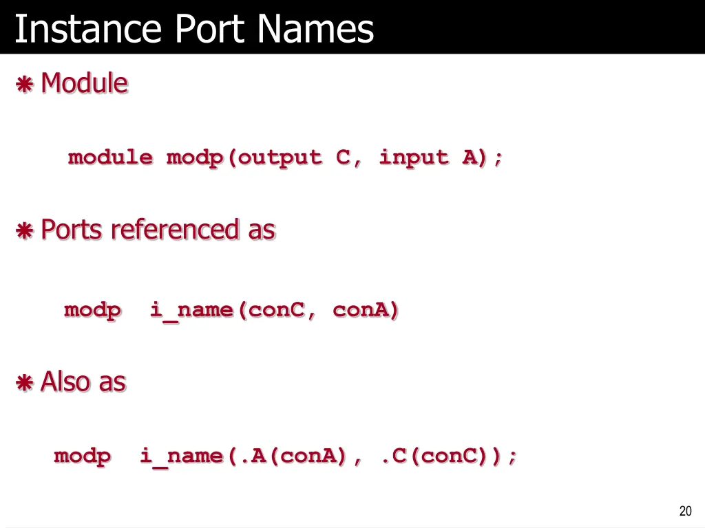Instance Port Names Module module modp(output C, input A); Ports referenced as modp i_name(conC, conA) Also as modp i_name(.A(conA), .C(conC)); 20