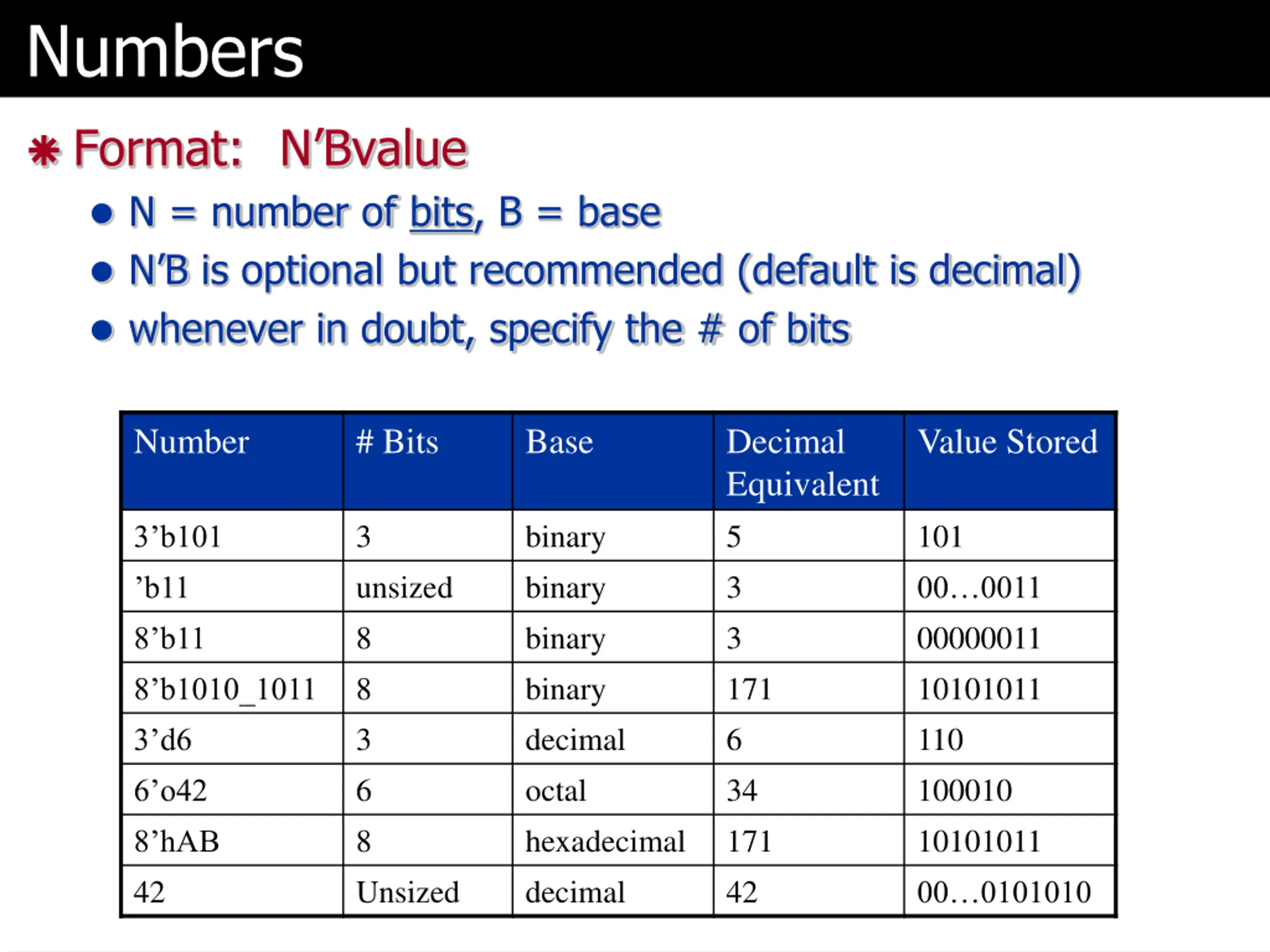 Numbers Format: N Bvalue N = number of bits, B = base N B is optional but recommended (default is decimal) whenever in doubt, specify the # of bits Number # Bits Base Decimal Equivalent 5 3 3 171 6 34 171 42 Value Stored 3 unsized 8 8 3 6 8 Unsized binary binary binary binary decimal octal hexadecimal decimal 101 00 0011 00000011 10101011 110 100010 10101011 00 0101010 3 b101 b11 8 b11 8 b1010_1011 3 d6 6 o42 8 hAB 42