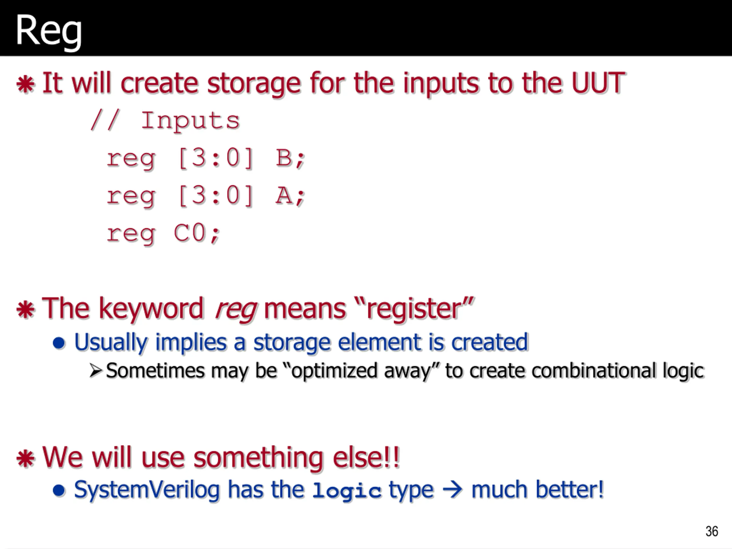 Reg It will create storage for the inputs to the UUT // Inputs reg [3:0] B; reg [3:0] A; reg C0; The keyword reg means register Usually implies a storage element is created Sometimes may be optimized away to create combinational logic We will use something else!! SystemVerilog has the logic type much better! 36