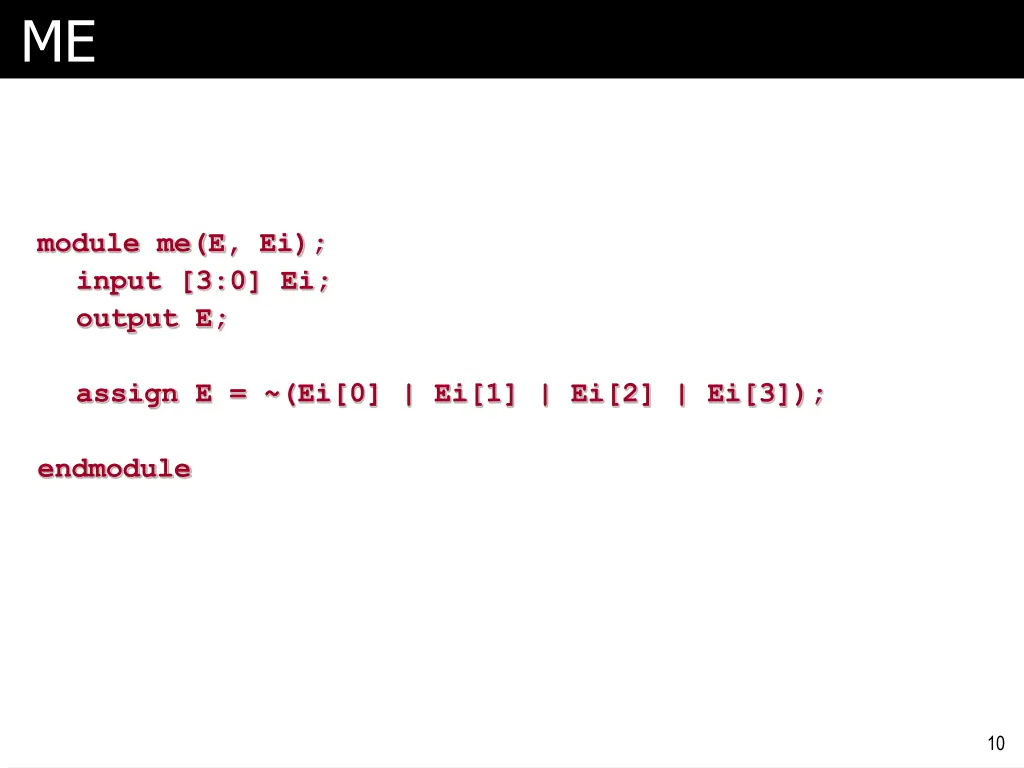 ME module me(E, Ei); input [3:0] Ei; output E; assign E = ~(Ei[0] | Ei[1] | Ei[2] | Ei[3]); endmodule 10