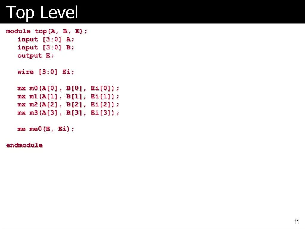 Top Level module top(A, B, E); input [3:0] A; input [3:0] B; output E; wire [3:0] Ei; mx m0(A[0], B[0], Ei[0]); mx m1(A[1], B[1], Ei[1]); mx m2(A[2], B[2], Ei[2]); mx m3(A[3], B[3], Ei[3]); me me0(E, Ei); endmodule 11