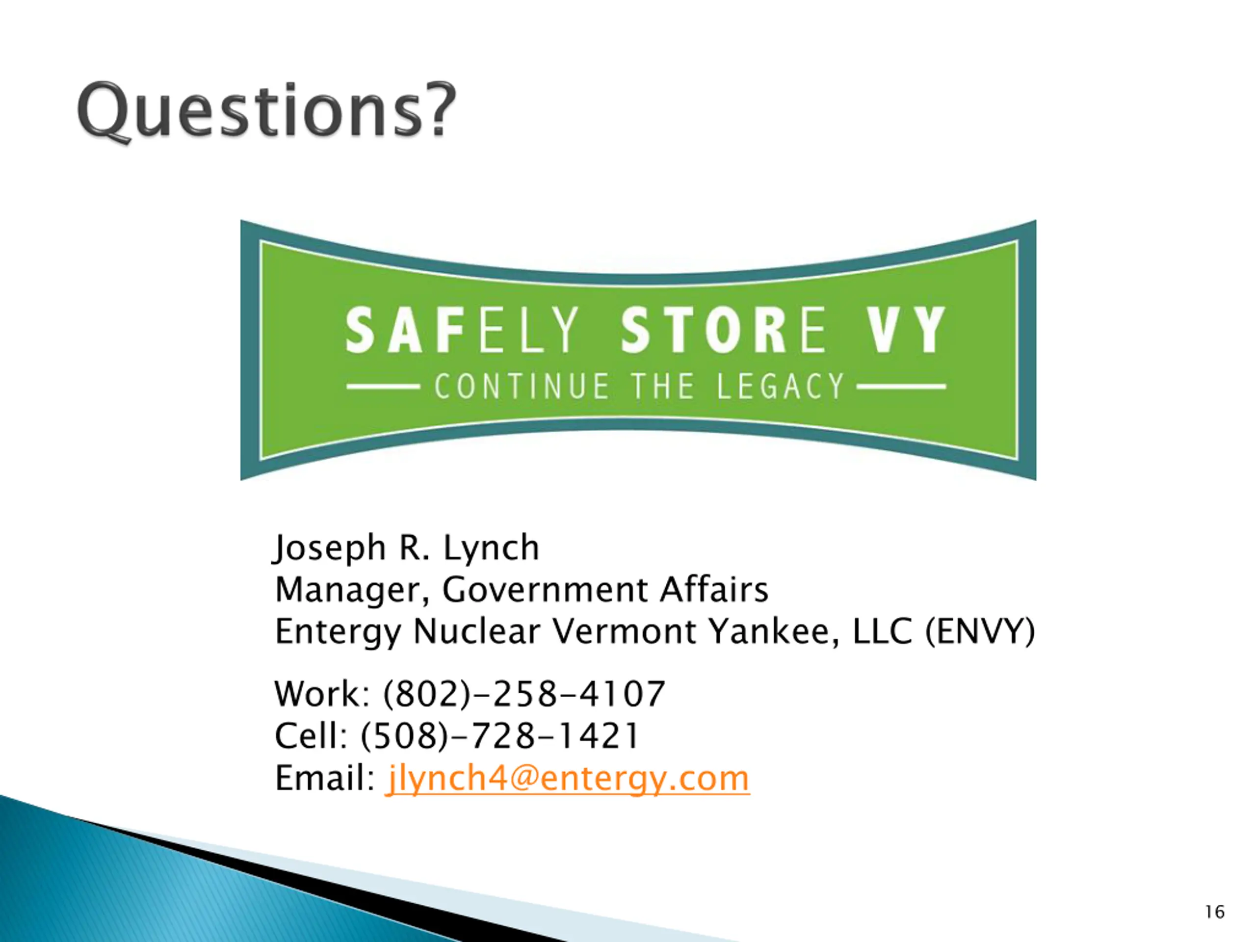 Joseph R. Lynch Manager, Government Affairs Entergy Nuclear Vermont Yankee, LLC (ENVY) Work: (802)-258-4107 Cell: (508)-728-1421 Email: jlynch4@entergy.com 16