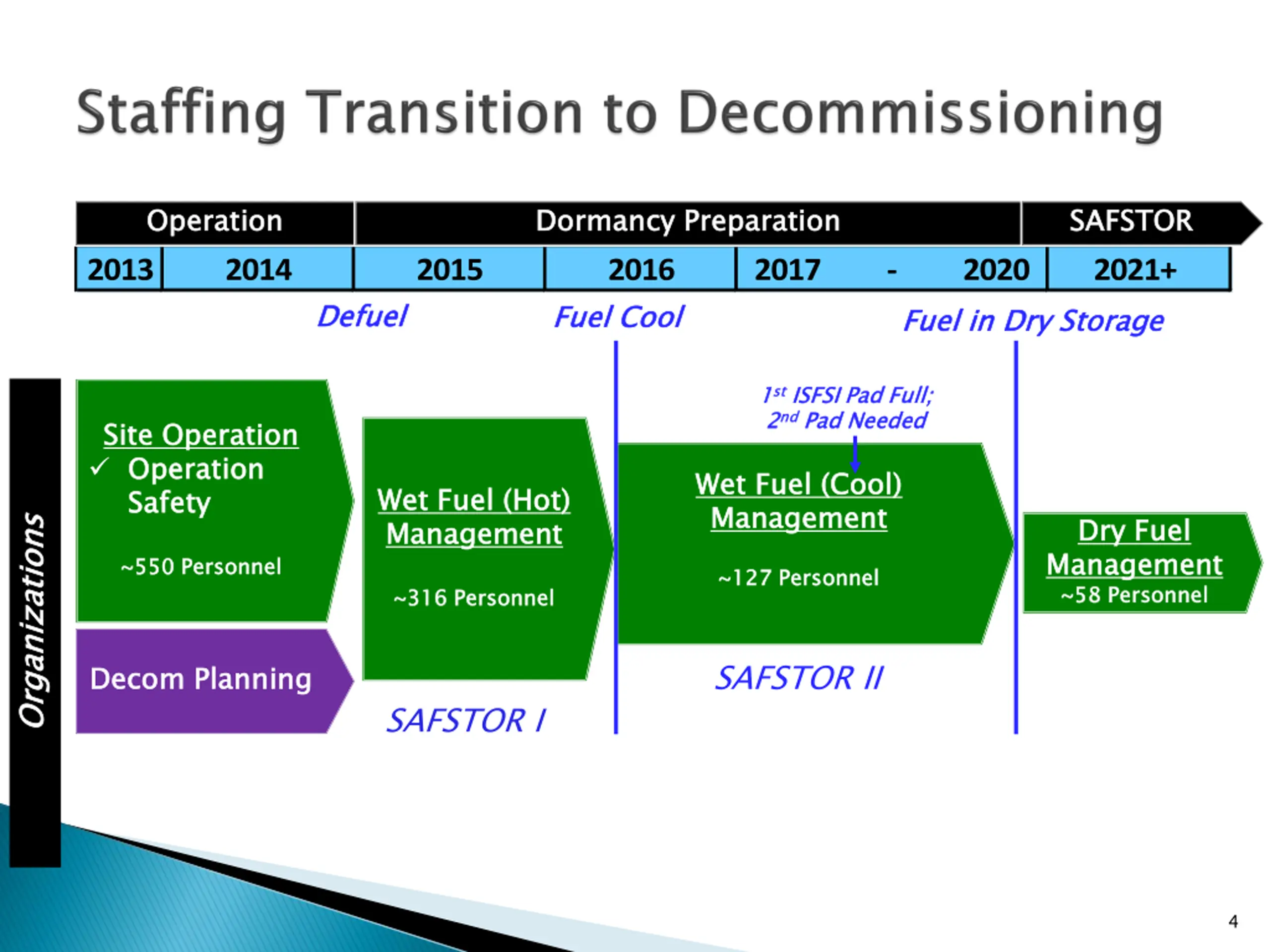 Operation Operation Dormancy Preparation Dormancy Preparation SAFSTOR SAFSTOR 2013 2014 2015 2016 2017 - 2020 2021+ Defuel Defuel Fuel Cool Fuel Cool Fuel in Dry Storage Fuel in Dry Storage 1 1st st ISFSI Pad Full; 2 2nd ISFSI Pad Full; nd Pad Needed Pad Needed Site Operation Operation Safety Site Operation Operation Safety Wet Fuel (Cool) Management Wet Fuel (Cool) Management Wet Fuel (Hot) Management Wet Fuel (Hot) Management Organizations Organizations Dry Fuel Management ~58 Personnel Dry Fuel Management ~58 Personnel ~550 Personnel ~550 Personnel ~127 Personnel ~127 Personnel ~316 Personnel ~316 Personnel SAFSTOR II Decom Planning Decom Planning SAFSTOR I 4