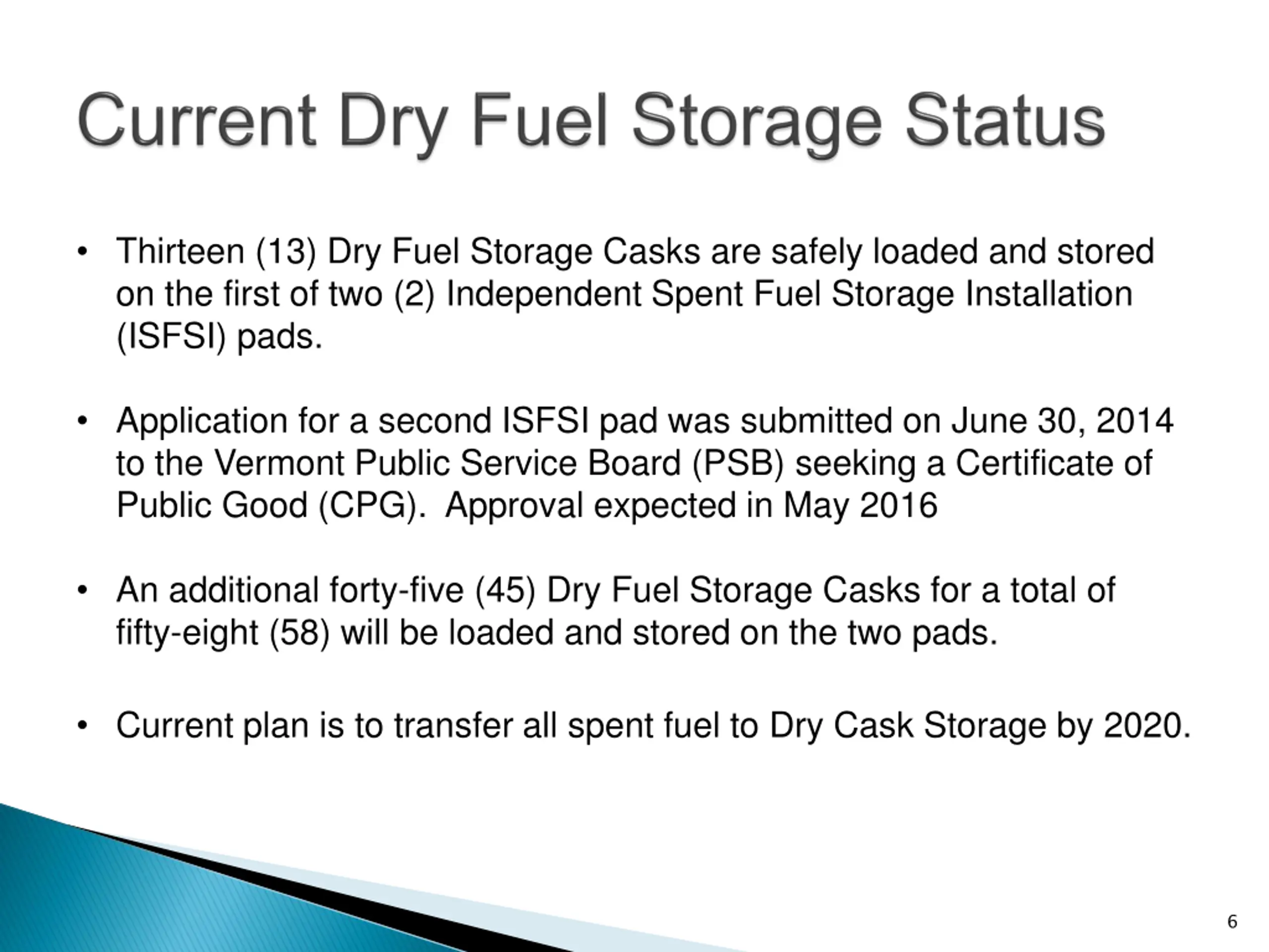 Thirteen (13) Dry Fuel Storage Casks are safely loaded and stored on the first of two (2) Independent Spent Fuel Storage Installation (ISFSI) pads. Application for a second ISFSI pad was submitted on June 30, 2014 to the Vermont Public Service Board (PSB) seeking a Certificate of Public Good (CPG). Approval expected in May 2016 An additional forty-five (45) Dry Fuel Storage Casks for a total of fifty-eight (58) will be loaded and stored on the two pads. Current plan is to transfer all spent fuel to Dry Cask Storage by 2020. 6