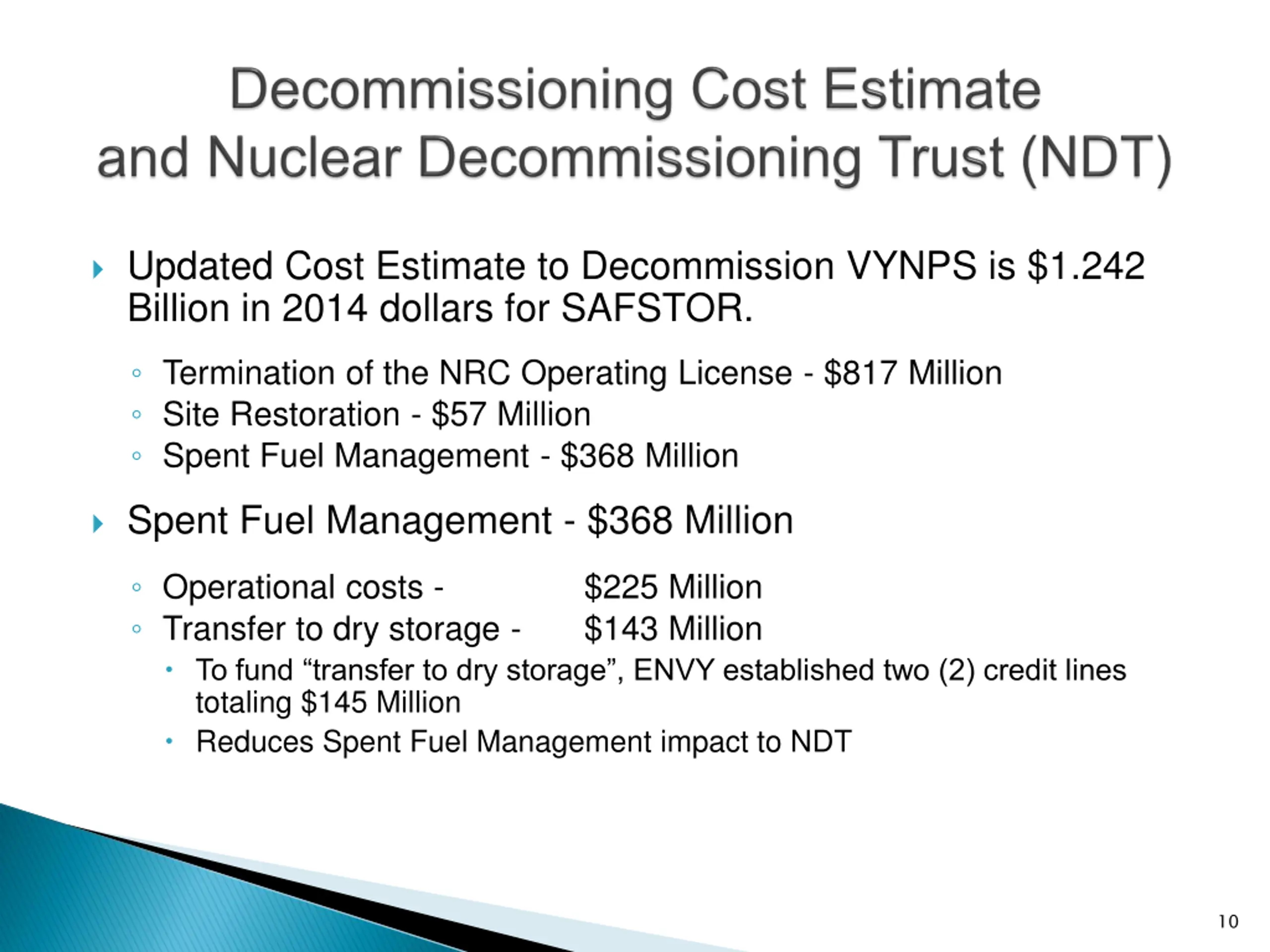 Updated Cost Estimate to Decommission VYNPS is $1.242 Billion in 2014 dollars for SAFSTOR. Termination of the NRC Operating License - $817 Million Site Restoration - $57 Million Spent Fuel Management - $368 Million Spent Fuel Management - $368 Million Operational costs - $225 Million Transfer to dry storage - $143 Million To fund transfer to dry storage , ENVY established two (2) credit lines totaling $145 Million Reduces Spent Fuel Management impact to NDT 10