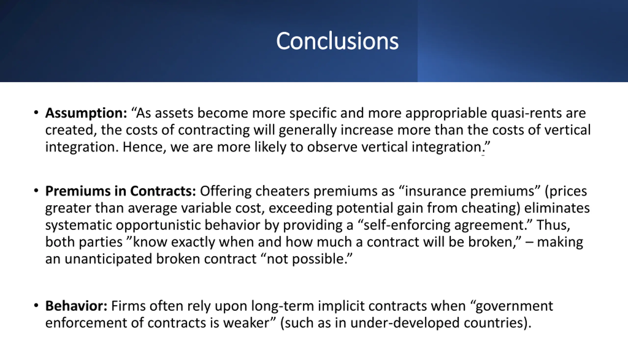 Conclusions Conclusions Assumption: As assets become more specific and more appropriable quasi-rents are created, the costs of contracting will generally increase more than the costs of vertical integration. Hence, we are more likely to observe vertical integration. Premiums in Contracts: Offering cheaters premiums as insurance premiums (prices greater than average variable cost, exceeding potential gain from cheating) eliminates systematic opportunistic behavior by providing a self-enforcing agreement. Thus, both parties know exactly when and how much a contract will be broken, making an unanticipated broken contract not possible. Behavior: Firms often rely upon long-term implicit contracts when government enforcement of contracts is weaker (such as in under-developed countries).