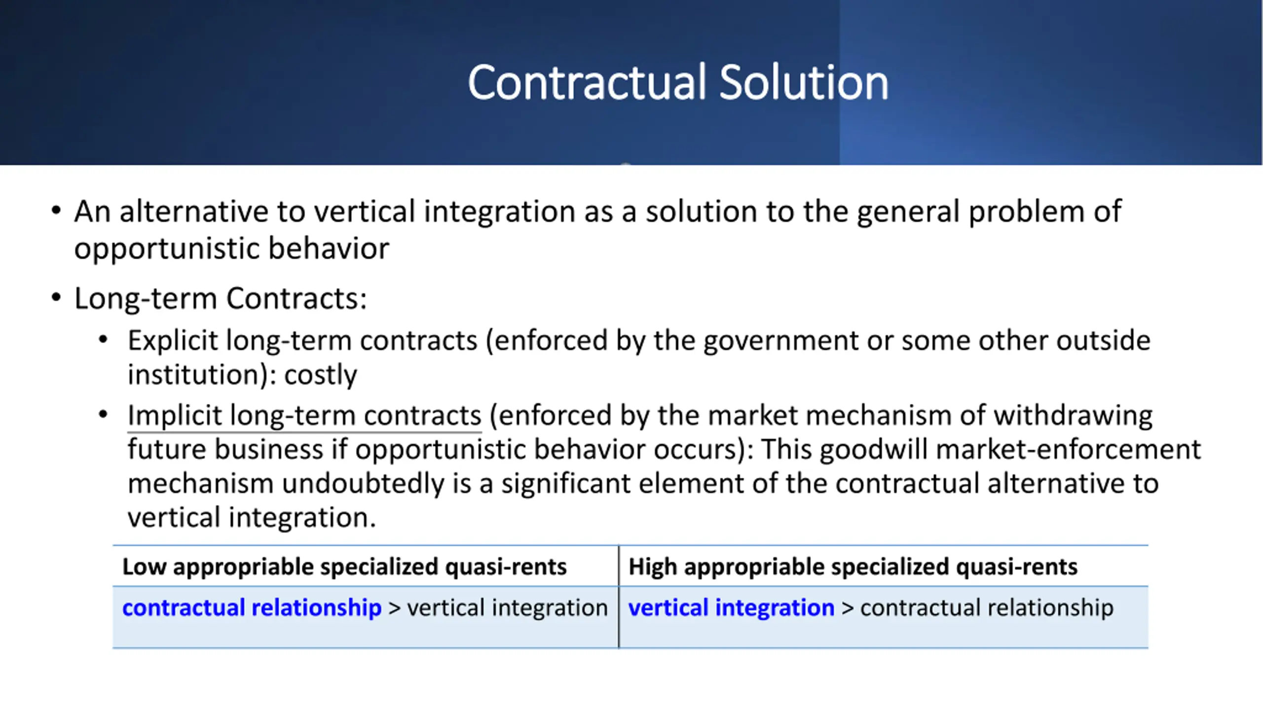 Contractual Solution Contractual Solution An alternative to vertical integration as a solution to the general problem of opportunistic behavior Long-term Contracts: Explicit long-term contracts (enforced by the government or some other outside institution): costly Implicit long-term contracts (enforced by the market mechanism of withdrawing future business if opportunistic behavior occurs): This goodwill market-enforcement mechanism undoubtedly is a significant element of the contractual alternative to vertical integration. Low appropriable specialized quasi-rents High appropriable specialized quasi-rents contractual relationship > vertical integration vertical integration > contractual relationship