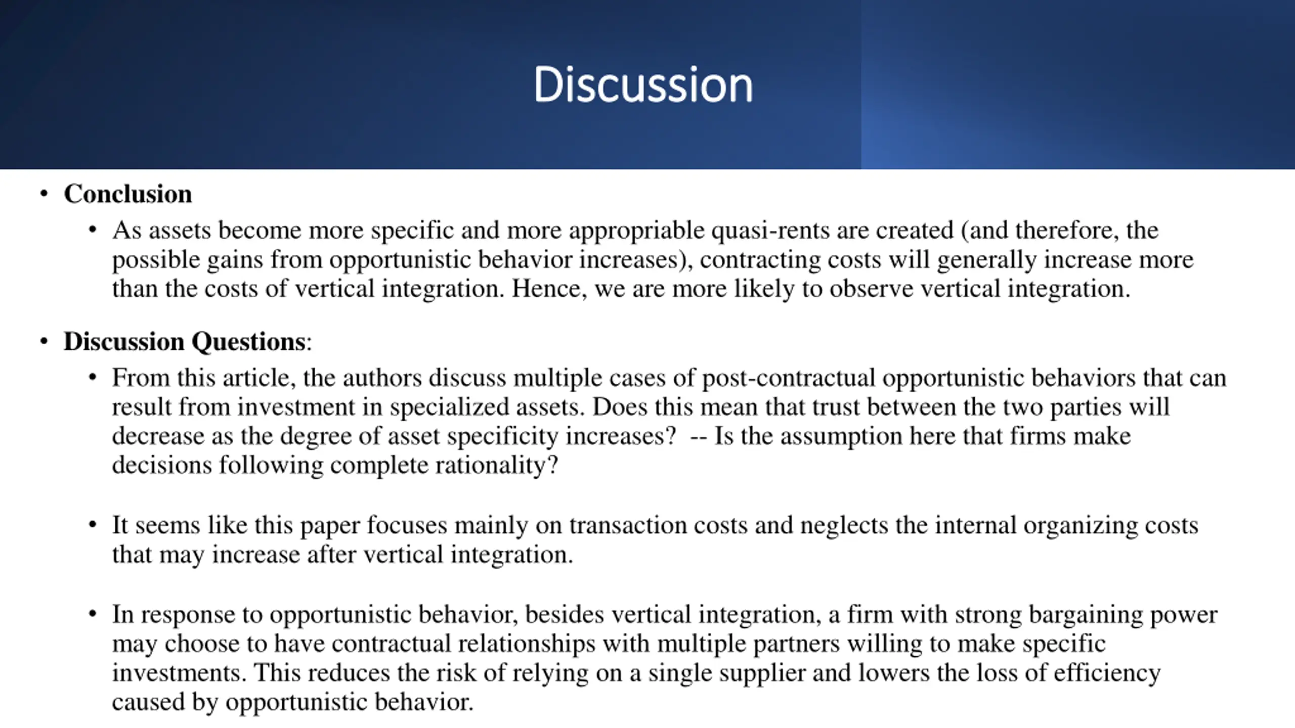 Discussion Discussion Conclusion As assets become more specific and more appropriable quasi-rents are created (and therefore, the possible gains from opportunistic behavior increases), contracting costs will generally increase more than the costs of vertical integration. Hence, we are more likely to observe vertical integration. Discussion Questions: From this article, the authors discuss multiple cases of post-contractual opportunistic behaviors that can result from investment in specialized assets. Does this mean that trust between the two parties will decrease as the degree of asset specificity increases? -- Is the assumption here that firms make decisions following complete rationality? It seems like this paper focuses mainly on transaction costs and neglects the internal organizing costs that may increase after vertical integration. In response to opportunistic behavior, besides vertical integration, a firm with strong bargaining power may choose to have contractual relationships with multiple partners willing to make specific investments. This reduces the risk of relying on a single supplier and lowers the loss of efficiency caused by opportunistic behavior.