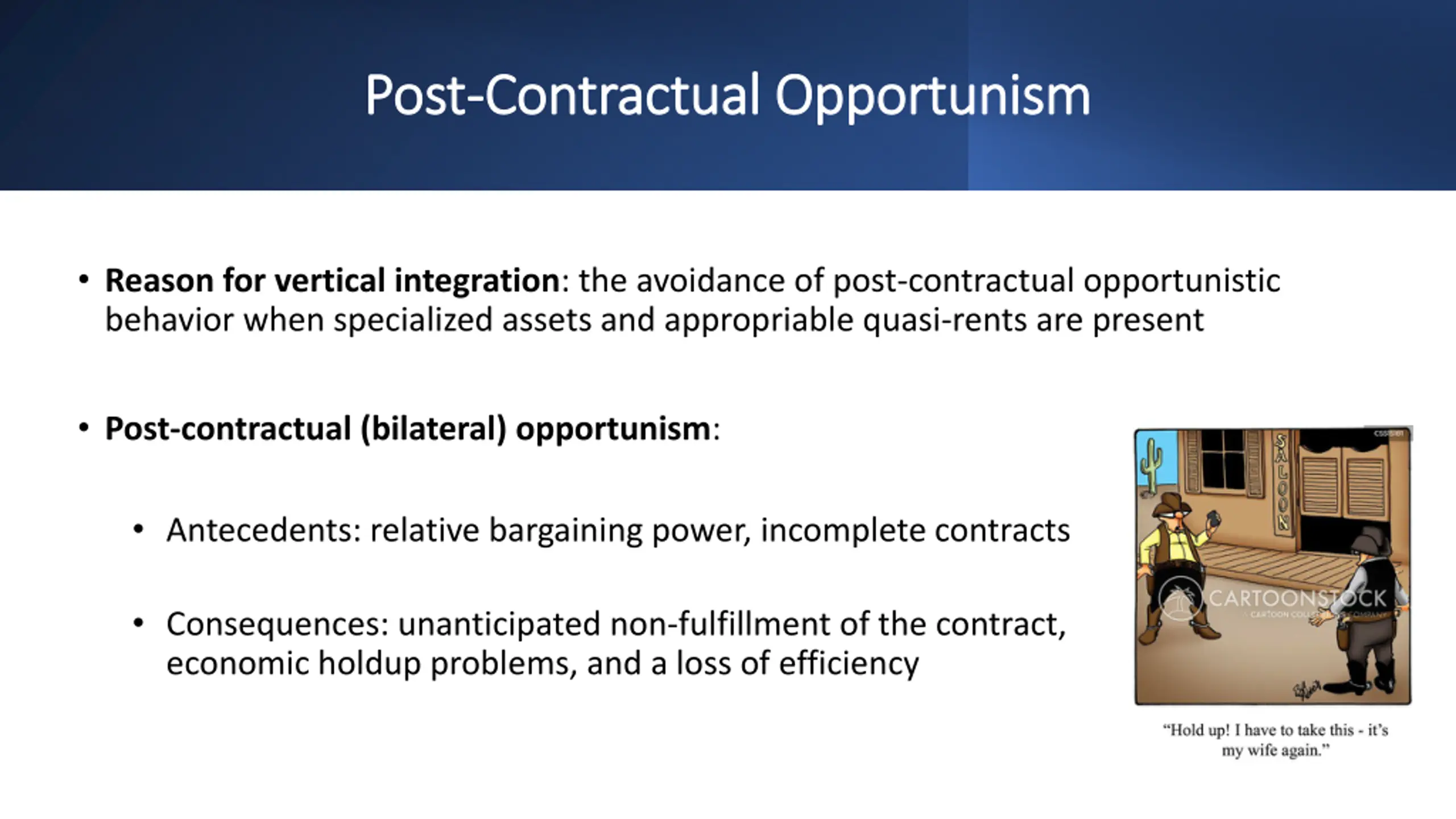 Post Post- -Contractual Opportunism Contractual Opportunism Reason for vertical integration: the avoidance of post-contractual opportunistic behavior when specialized assets and appropriable quasi-rents are present Post-contractual (bilateral) opportunism: Antecedents: relative bargaining power, incomplete contracts Consequences: unanticipated non-fulfillment of the contract, economic holdup problems, and a loss of efficiency