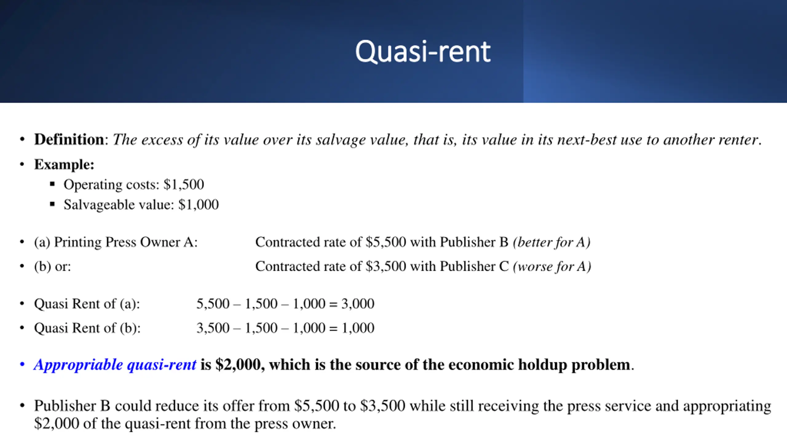 Quasi Quasi- -rent rent Definition: The excess of its value over its salvage value, that is, its value in its next-best use to another renter. Example: Operating costs: $1,500 Salvageable value: $1,000 (a) Printing Press Owner A: Contracted rate of $5,500 with Publisher B (better for A) (b) or: Contracted rate of $3,500 with Publisher C (worse for A) Quasi Rent of (a): 5,500 1,500 1,000 = 3,000 Quasi Rent of (b): 3,500 1,500 1,000 = 1,000 Appropriable quasi-rent is $2,000, which is the source of the economic holdup problem. Publisher B could reduce its offer from $5,500 to $3,500 while still receiving the press service and appropriating $2,000 of the quasi-rent from the press owner.