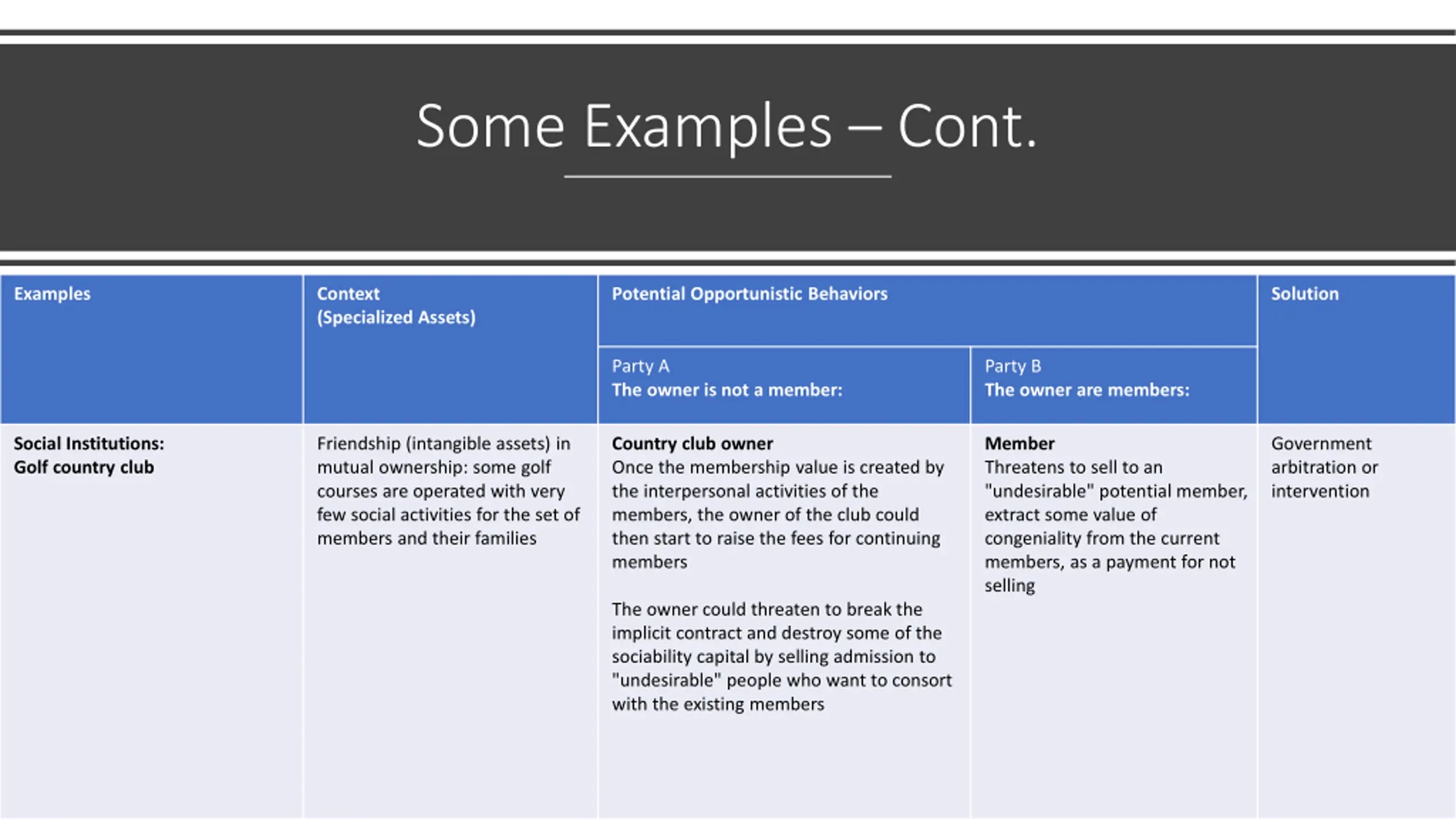 Some Examples Cont. Examples Context (Specialized Assets) Potential Opportunistic Behaviors Solution Party A The owner is not a member: Party B The owner are members: Social Institutions: Golf country club Friendship (intangible assets) in mutual ownership: some golf courses are operated with very few social activities for the set of members and their families Country club owner Once the membership value is created by the interpersonal activities of the members, the owner of the club could then start to raise the fees for continuing members Member Threatens to sell to an "undesirable" potential member, extract some value of congeniality from the current members, as a payment for not selling Government arbitration or intervention The owner could threaten to break the implicit contract and destroy some of the sociability capital by selling admission to "undesirable" people who want to consort with the existing members
