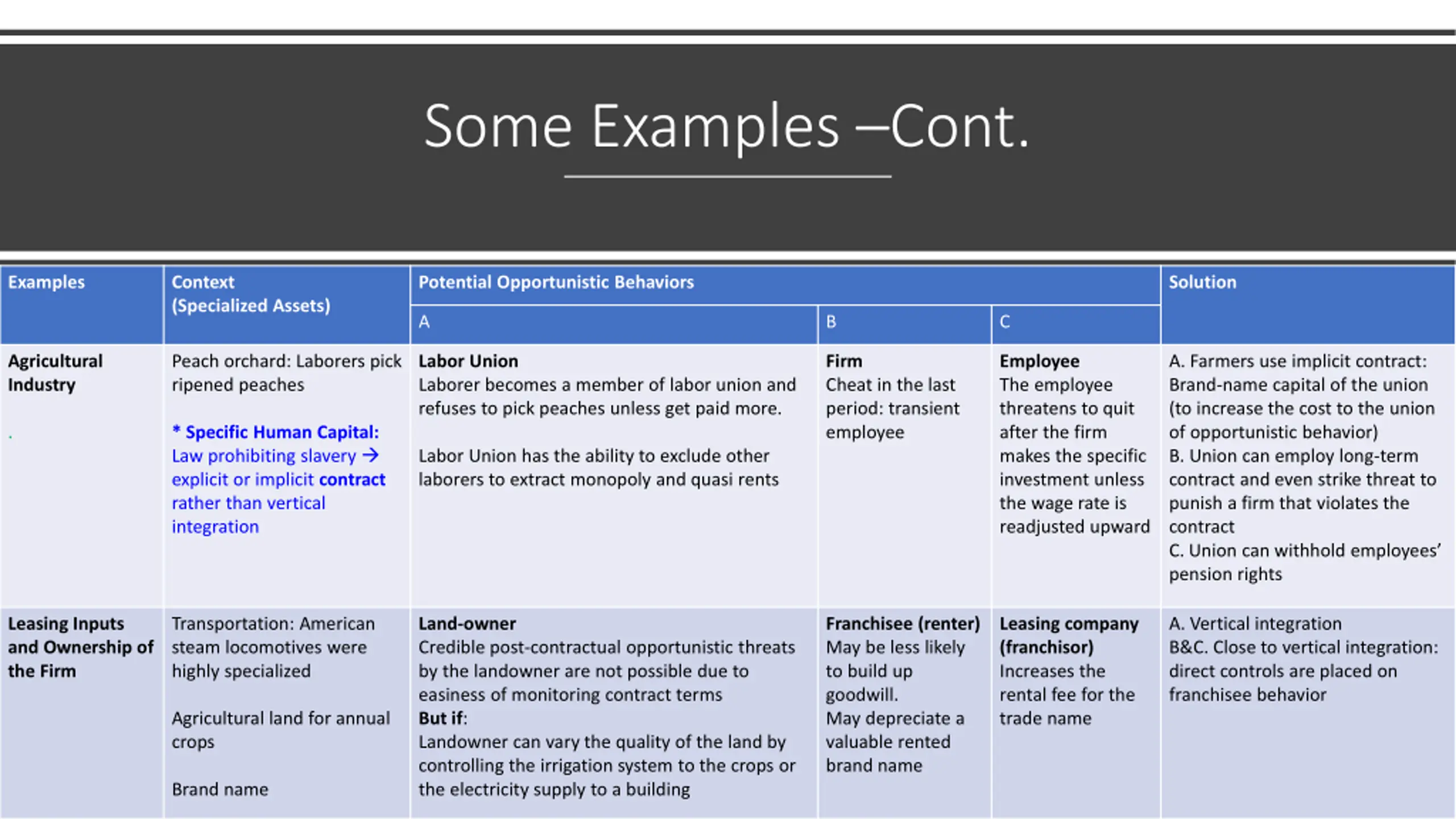 Some Examples Cont. Examples Context (Specialized Assets) Potential Opportunistic Behaviors Solution A B C Agricultural Industry Peach orchard: Laborers pick ripened peaches Labor Union Laborer becomes a member of labor union and refuses to pick peaches unless get paid more. Firm Cheat in the last period: transient employee Employee The employee threatens to quit after the firm makes the specific investment unless the wage rate is readjusted upward A. Farmers use implicit contract: Brand-name capital of the union (to increase the cost to the union of opportunistic behavior) B. Union can employ long-term contract and even strike threat to punish a firm that violates the contract C. Union can withhold employees pension rights . * Specific Human Capital: Law prohibiting slavery explicit or implicit contract rather than vertical integration Labor Union has the ability to exclude other laborers to extract monopoly and quasi rents Leasing Inputs and Ownership of the Firm Transportation: American steam locomotives were highly specialized Land-owner Credible post-contractual opportunistic threats by the landowner are not possible due to easiness of monitoring contract terms But if: Landowner can vary the quality of the land by controlling the irrigation system to the crops or the electricity supply to a building Franchisee (renter) May be less likely to build up goodwill. May depreciate a valuable rented brand name Leasing company (franchisor) Increases the rental fee for the trade name A. Vertical integration B&C. Close to vertical integration: direct controls are placed on franchisee behavior Agricultural land for annual crops Brand name