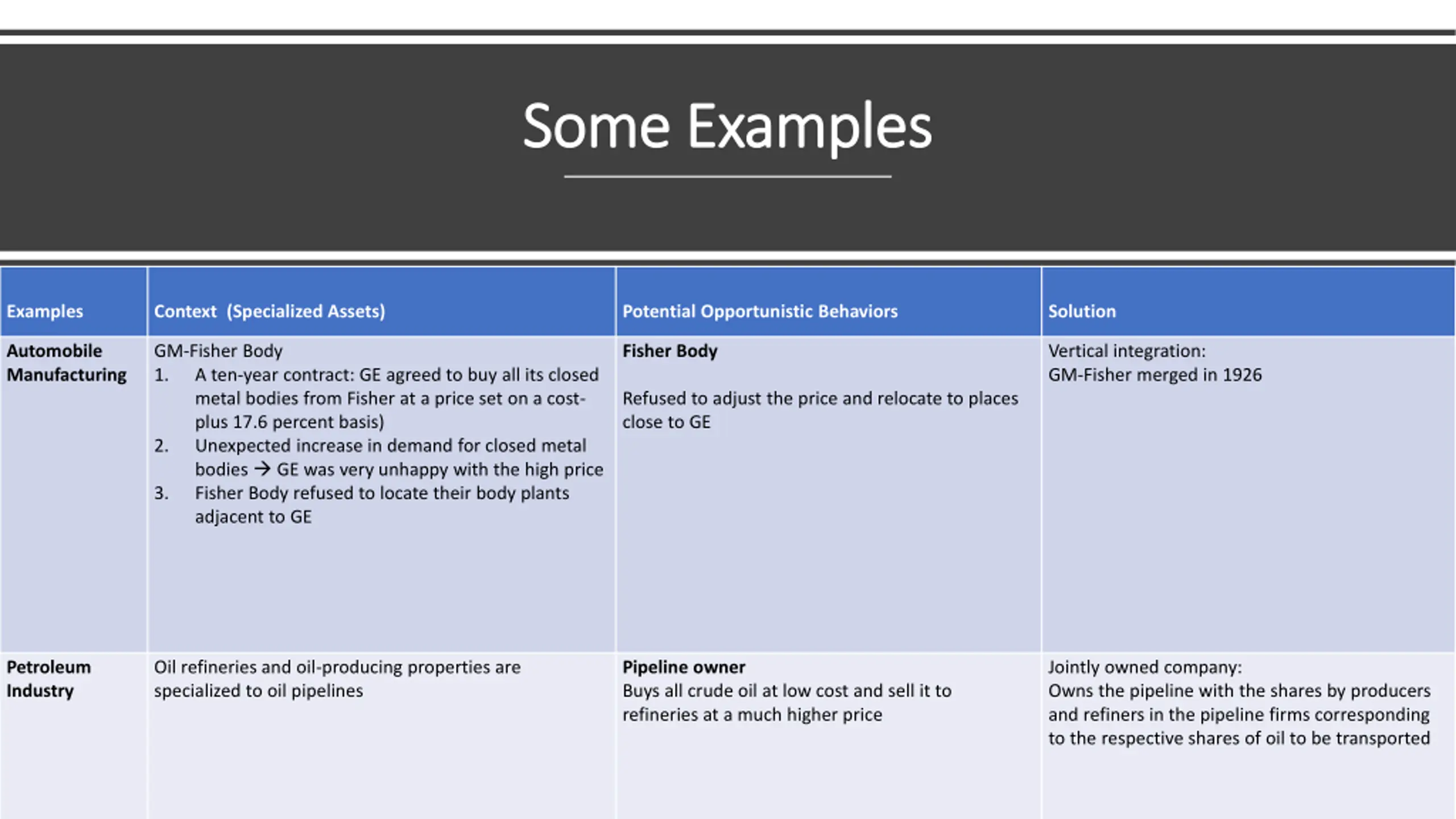 Some Examples Some Examples Examples Context (Specialized Assets) Potential Opportunistic Behaviors Solution Automobile Manufacturing GM-Fisher Body 1. A ten-year contract: GE agreed to buy all its closed metal bodies from Fisher at a price set on a cost- plus 17.6 percent basis) 2. Unexpected increase in demand for closed metal bodies GE was very unhappy with the high price 3. Fisher Body refused to locate their body plants adjacent to GE Fisher Body Vertical integration: GM-Fisher merged in 1926 Refused to adjust the price and relocate to places close to GE Petroleum Industry Oil refineries and oil-producing properties are specialized to oil pipelines Pipeline owner Buys all crude oil at low cost and sell it to refineries at a much higher price Jointly owned company: Owns the pipeline with the shares by producers and refiners in the pipeline firms corresponding to the respective shares of oil to be transported