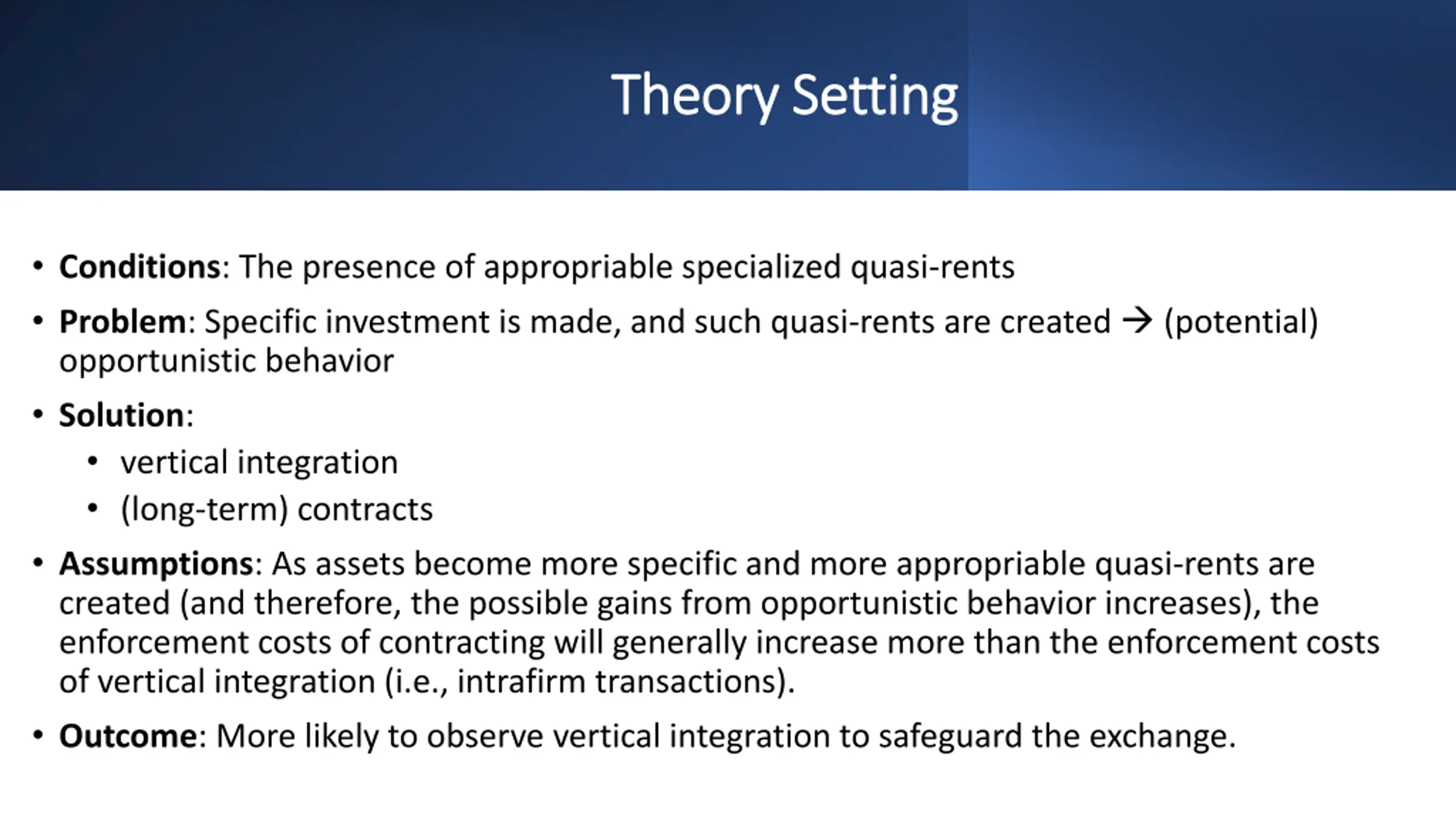 Theory Setting Theory Setting Conditions: The presence of appropriable specialized quasi-rents Problem: Specific investment is made, and such quasi-rents are created (potential) opportunistic behavior Solution: vertical integration (long-term) contracts Assumptions: As assets become more specific and more appropriable quasi-rents are created (and therefore, the possible gains from opportunistic behavior increases), the enforcement costs of contracting will generally increase more than the enforcement costs of vertical integration (i.e., intrafirm transactions). Outcome: More likely to observe vertical integration to safeguard the exchange.