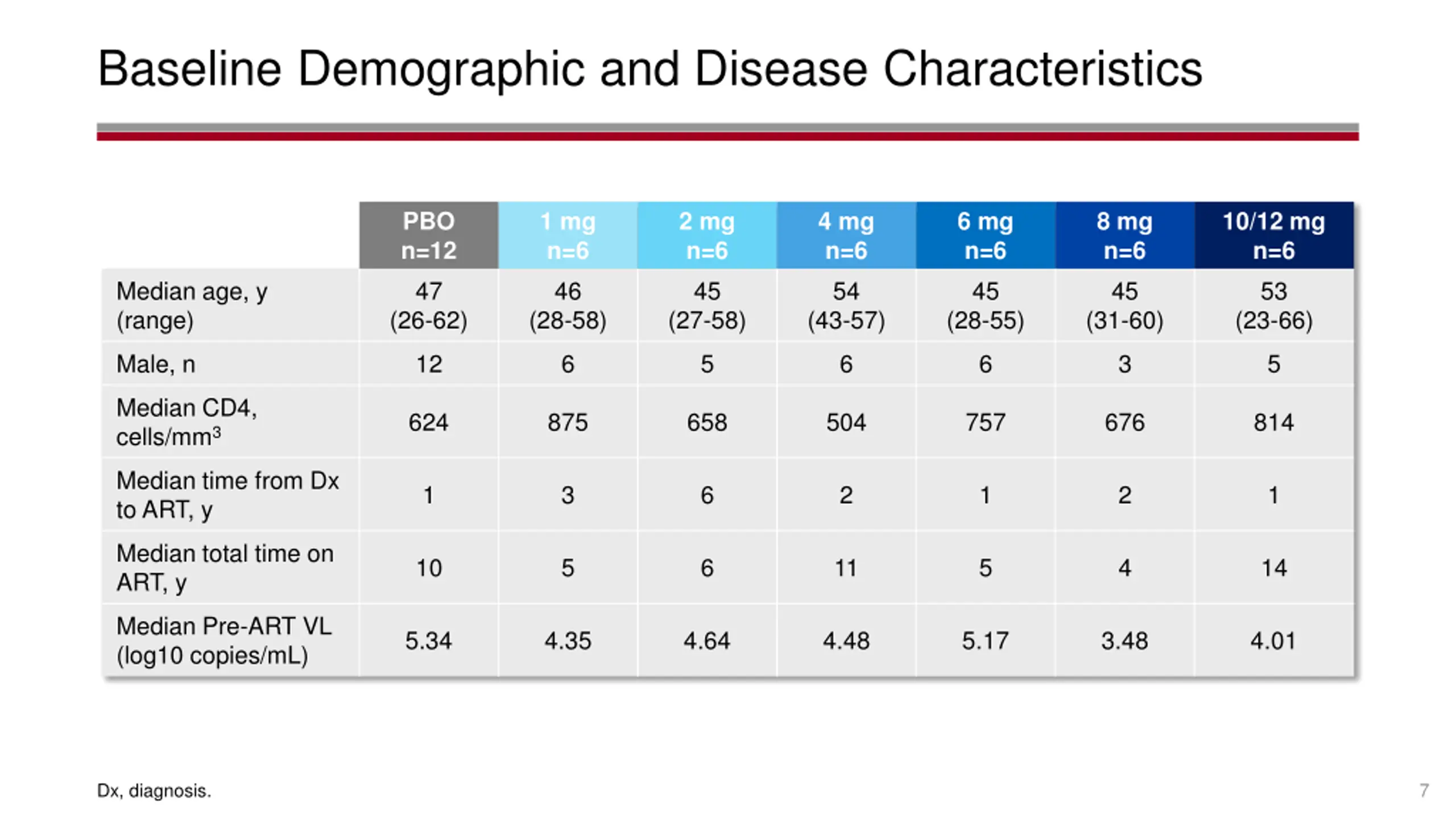 Baseline Demographic and Disease Characteristics PBO n=12 47 (26-62) 1 mg n=6 46 (28-58) 2 mg n=6 45 (27-58) 4 mg n=6 54 (43-57) 6 mg n=6 45 (28-55) 8 mg n=6 45 (31-60) 10/12 mg n=6 53 (23-66) Median age, y (range) Male, n 12 6 5 6 6 3 5 Median CD4, cells/mm3 624 875 658 504 757 676 814 Median time from Dx to ART, y 1 3 6 2 1 2 1 Median total time on ART, y 10 5 6 11 5 4 14 Median Pre-ART VL (log10 copies/mL) 5.34 4.35 4.64 4.48 5.17 3.48 4.01 Dx, diagnosis. 7