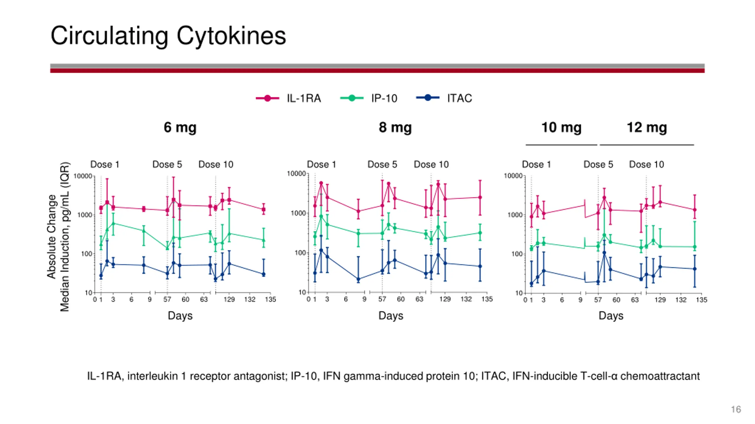 Circulating Cytokines IL-1RA IP-10 ITAC 6 mg 8 mg 10 mg 12 mg Dose 1 Dose 5 Dose 10 Dose 1 Dose 5 Dose 10 Dose 1 Dose 5 Dose 10 Median Induction, pg/mL (IQR) 10000 10000 10000 Absolute Change 1000 1000 1000 100 100 100 10 10 10 0 3 6 9 57 60 63 129 132 135 1 0 3 6 9 57 60 63 129 132 135 1 0 3 6 9 57 60 63 129 132 135 1 Days Days Days IL-1RA, interleukin 1 receptor antagonist; IP-10, IFN gamma-induced protein 10; ITAC, IFN-inducible T-cell- chemoattractant 16