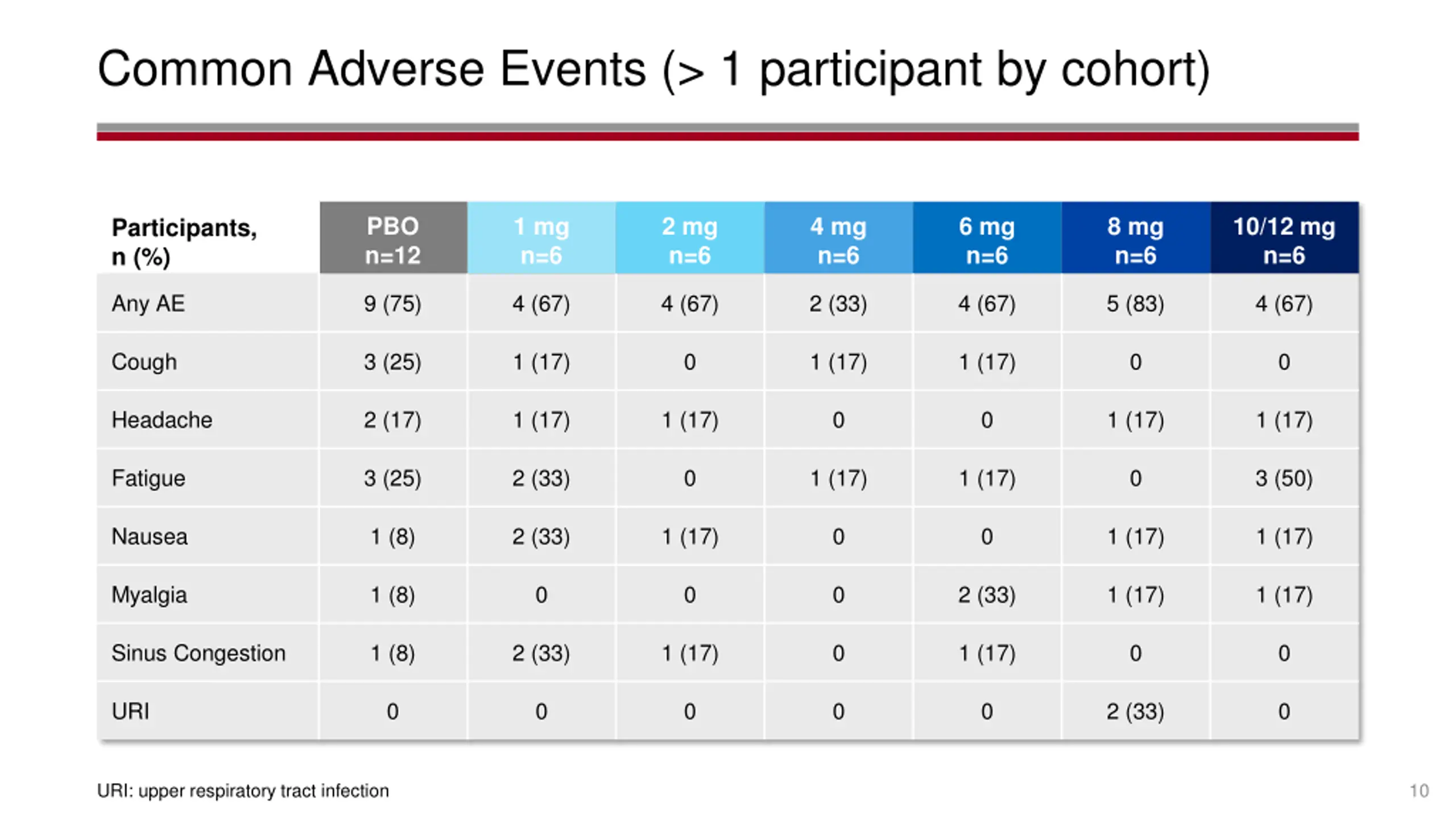 Common Adverse Events (> 1 participant by cohort) PBO n=12 1 mg n=6 2 mg n=6 4 mg n=6 6 mg n=6 8 mg n=6 10/12 mg n=6 Participants, n (%) Any AE 9 (75) 4 (67) 4 (67) 2 (33) 4 (67) 5 (83) 4 (67) Cough 3 (25) 1 (17) 0 1 (17) 1 (17) 0 0 Headache 2 (17) 1 (17) 1 (17) 0 0 1 (17) 1 (17) Fatigue 3 (25) 2 (33) 0 1 (17) 1 (17) 0 3 (50) Nausea 1 (8) 2 (33) 1 (17) 0 0 1 (17) 1 (17) Myalgia 1 (8) 0 0 0 2 (33) 1 (17) 1 (17) Sinus Congestion 1 (8) 2 (33) 1 (17) 0 1 (17) 0 0 URI 0 0 0 0 0 2 (33) 0 URI: upper respiratory tract infection 10