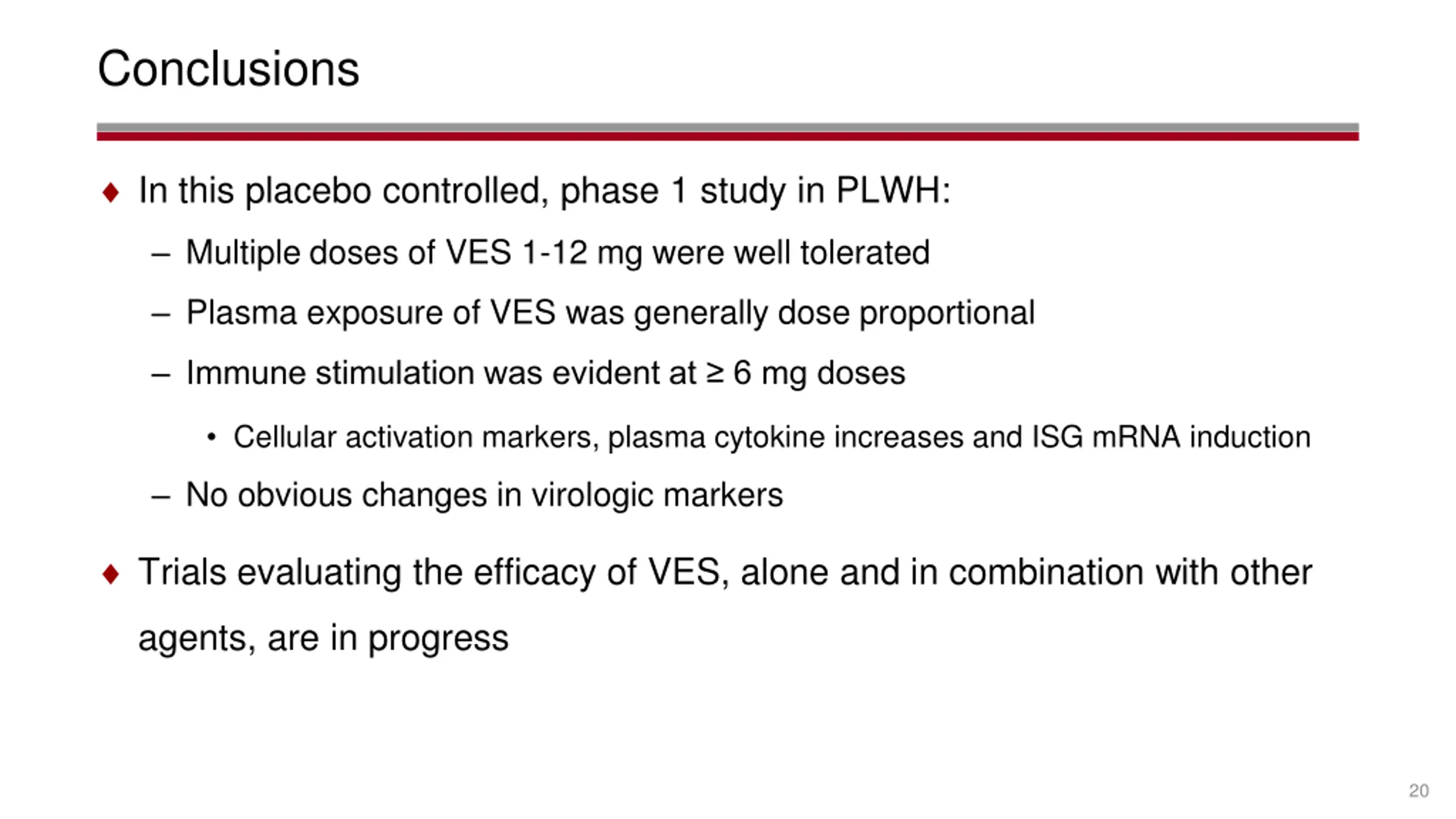 Conclusions In this placebo controlled, phase 1 study in PLWH: Multiple doses of VES 1-12 mg were well tolerated Plasma exposure of VES was generally dose proportional Immune stimulation was evident at 6 mg doses Cellular activation markers, plasma cytokine increases and ISG mRNA induction No obvious changes in virologic markers Trials evaluating the efficacy of VES, alone and in combination with other agents, are in progress 20