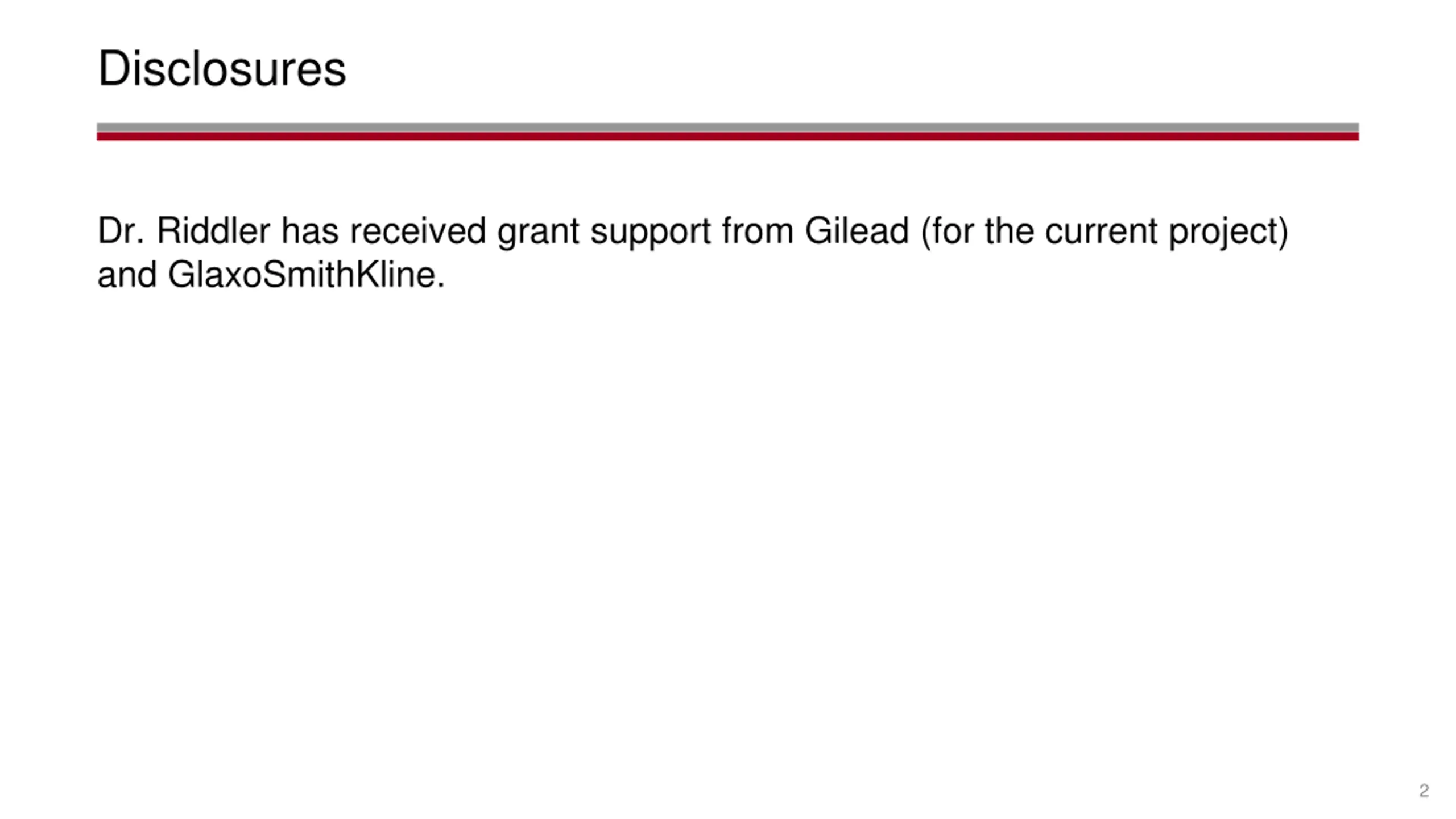 Disclosures Dr. Riddler has received grant support from Gilead (for the current project) and GlaxoSmithKline. 2