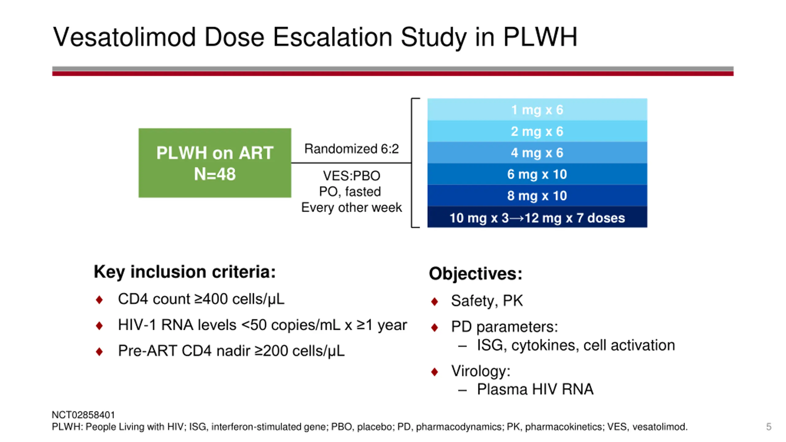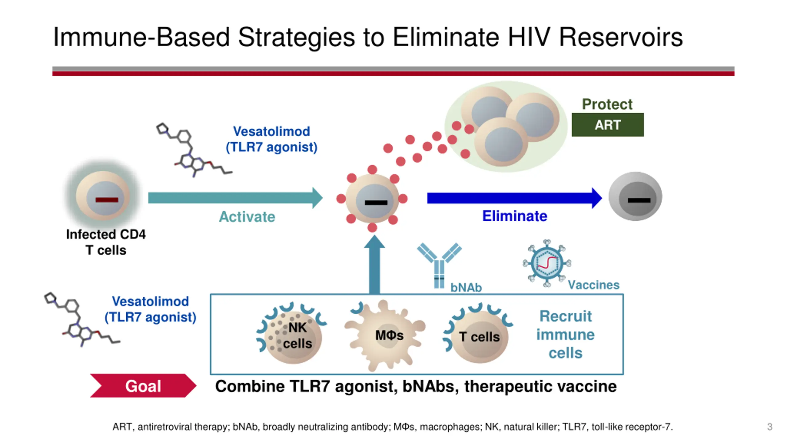 A study reported the safety and pharmacodynamic activity of vesatolimod (GS-9620) in HIV-infected individuals. The research included dose escalation studies in people living with HIV on antiretroviral therapy, showing promising results. Immune-based strategies to eliminate HIV reservoirs, including vesatolimod's role in recruiting immune cells, were also discussed.