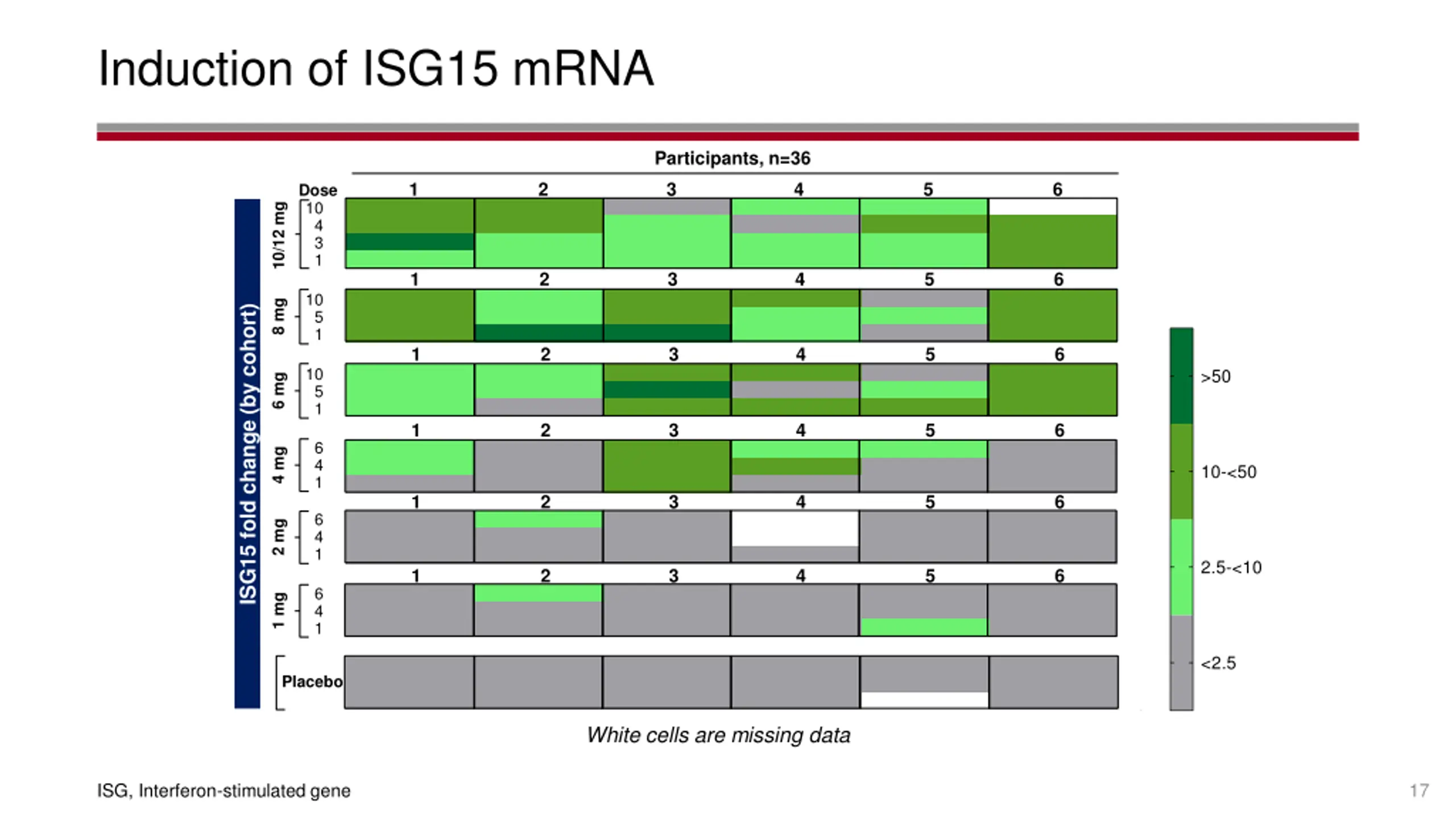 Induction of ISG15 mRNA Participants, n=36 1 2 3 4 5 6 Dose 10 4 3 1 10/12 mg >50 >50 >50 1 2 3 4 5 6 10 8 mg ISG15 fold change (by cohort) >50 5 1 >50 10-<50 10-<50 >50 10-<50 1 2 3 4 5 6 10 >50 6 mg 5 1 10-<50 10-<50 2.5-<10 2.5-<10 10-<50 2.5-<10 1 2 3 4 5 6 6 4 1 4 mg 10-<50 1 2 3 4 5 6 2.5-<10 6 4 1 2.5-<10 <2.5 <2.5 2.5-<10 <2.5 2 mg 2.5-<10 1 2 3 4 5 6 6 4 1 <2.5 1 mg <2.5 <2.5 <2.5 Placebo White cells are missing data ISG, Interferon-stimulated gene 17