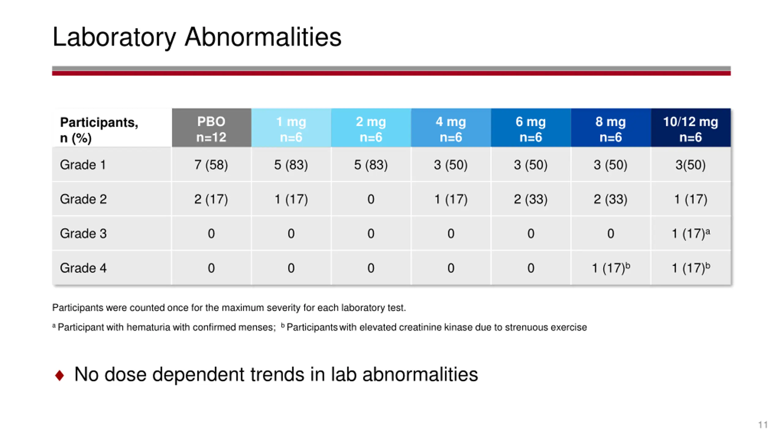 Laboratory Abnormalities PBO n=12 1 mg n=6 2 mg n=6 4 mg n=6 6 mg n=6 8 mg n=6 10/12 mg n=6 Participants, n (%) Grade 1 7 (58) 5 (83) 5 (83) 3 (50) 3 (50) 3 (50) 3(50) Grade 2 2 (17) 1 (17) 0 1 (17) 2 (33) 2 (33) 1 (17) Grade 3 0 0 0 0 0 0 1 (17)a Grade 4 0 0 0 0 0 1 (17)b 1 (17)b Participants were counted once for the maximum severity for each laboratory test. a Participant with hematuria with confirmed menses; b Participantswith elevated creatinine kinase due to strenuous exercise No dose dependent trends in lab abnormalities 11